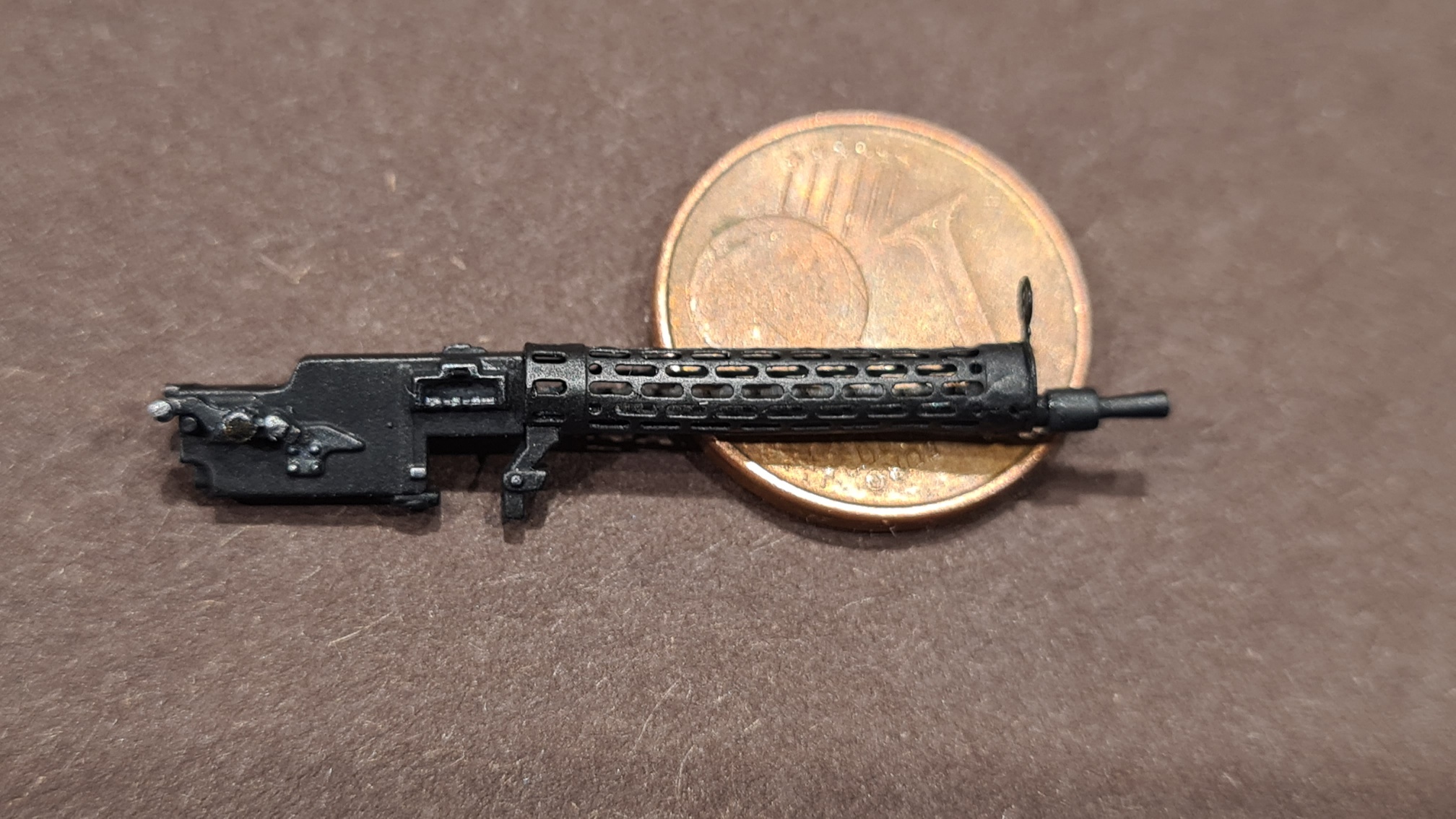Alles zusammengesteckt, schwarz gesprüht. Nur der Lauf wurde mit Stahl (Alclad 2 ALC112) stahlfarben gesprüht. Da kommt man ja hinterher nicht mehr dran.