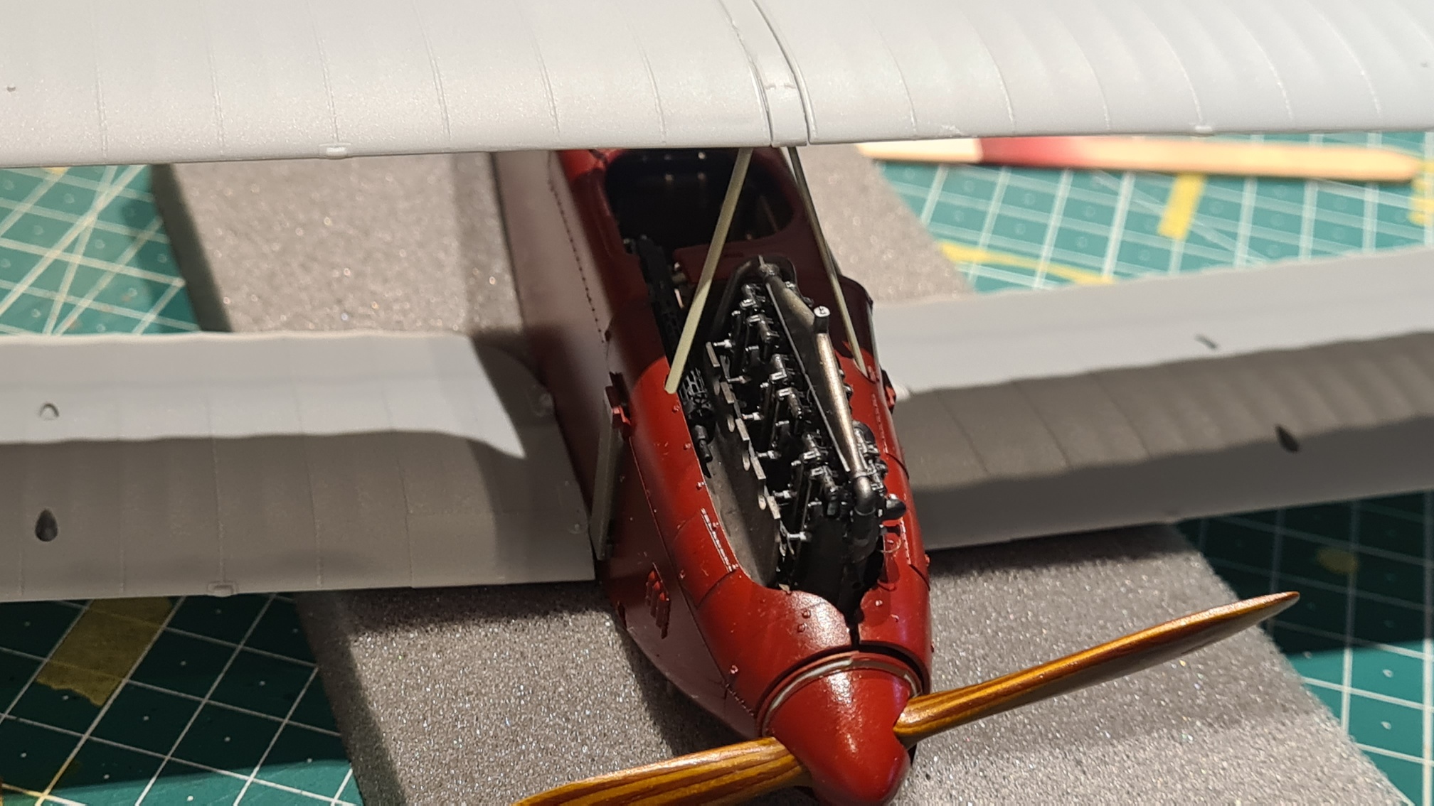 Zum Spaß wurden mal weitere Motorhaubenteile und Propeller gesteckt. Abdeckung vom Propeller liegt nur auf dem Propeller. Und mal die Flügel gesteckt. In den Momenten kann man es nicht erwarten