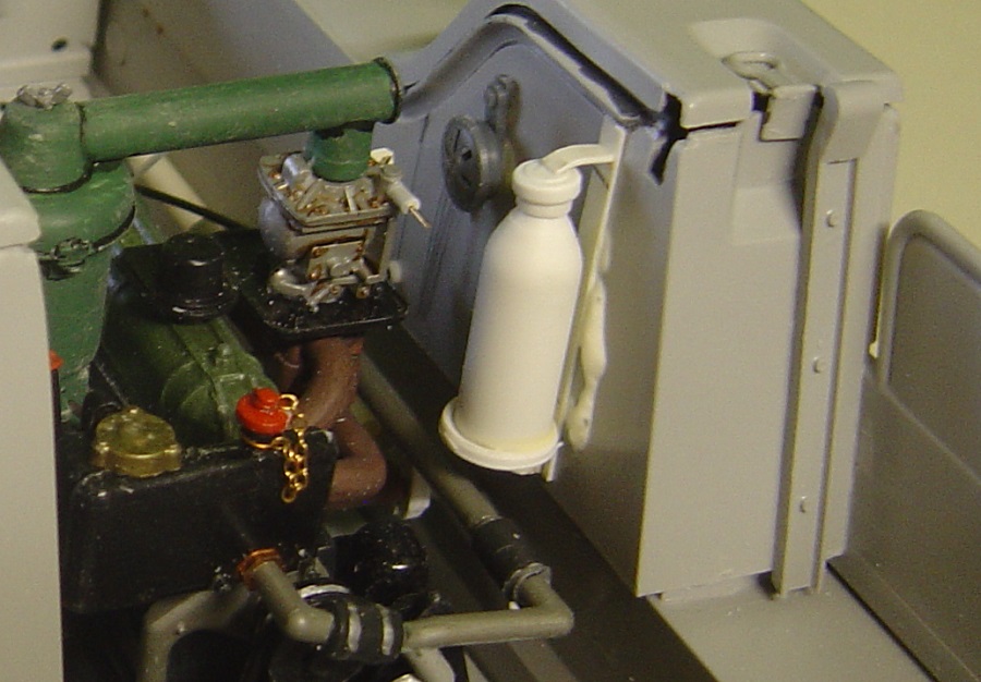 Die Fahrzeughupe und eine Ölflasche. In der Winterversion war noch eine Kaltstarthilfe verbaut. .