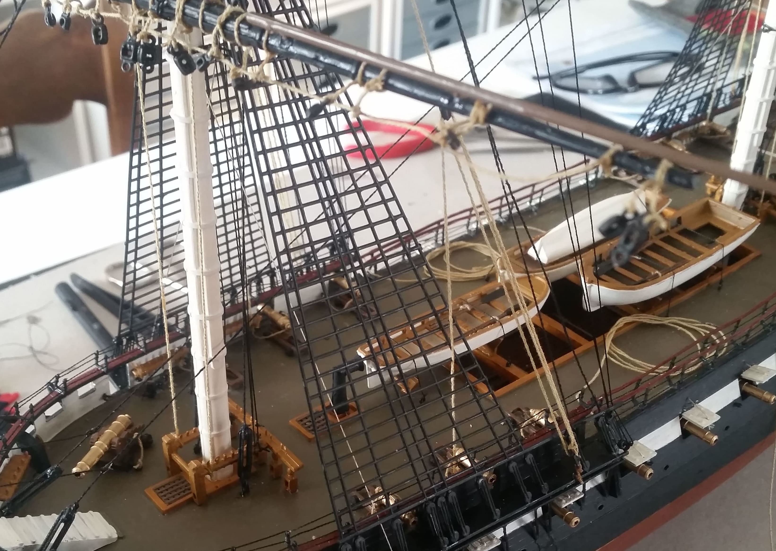 Der Fockmast ist jetzt hinten den Segeln vertakelt. Auch das große Segel vom Hauptmast. Ist schon alles sehr schwierig. Deshalb habe ich mir eine Lupenbrille mit Beleuchtung zugelegt. Ansonsten kann ich selbst mit Brille nur schlecht sehen, ob sich Taue verheddern, wegdrücken oder sich verfädeln. Dazu sind es inzwischen zu viele Seile. Auch das Anbringen an den Nagelbrettern geht mit Lupenbrille viel besser. Trotzdem bleibt es vor allem bei dem wenigen Platz am Fock- und am Hauptmast ein ziemlich langwieriges Herumgefummel.