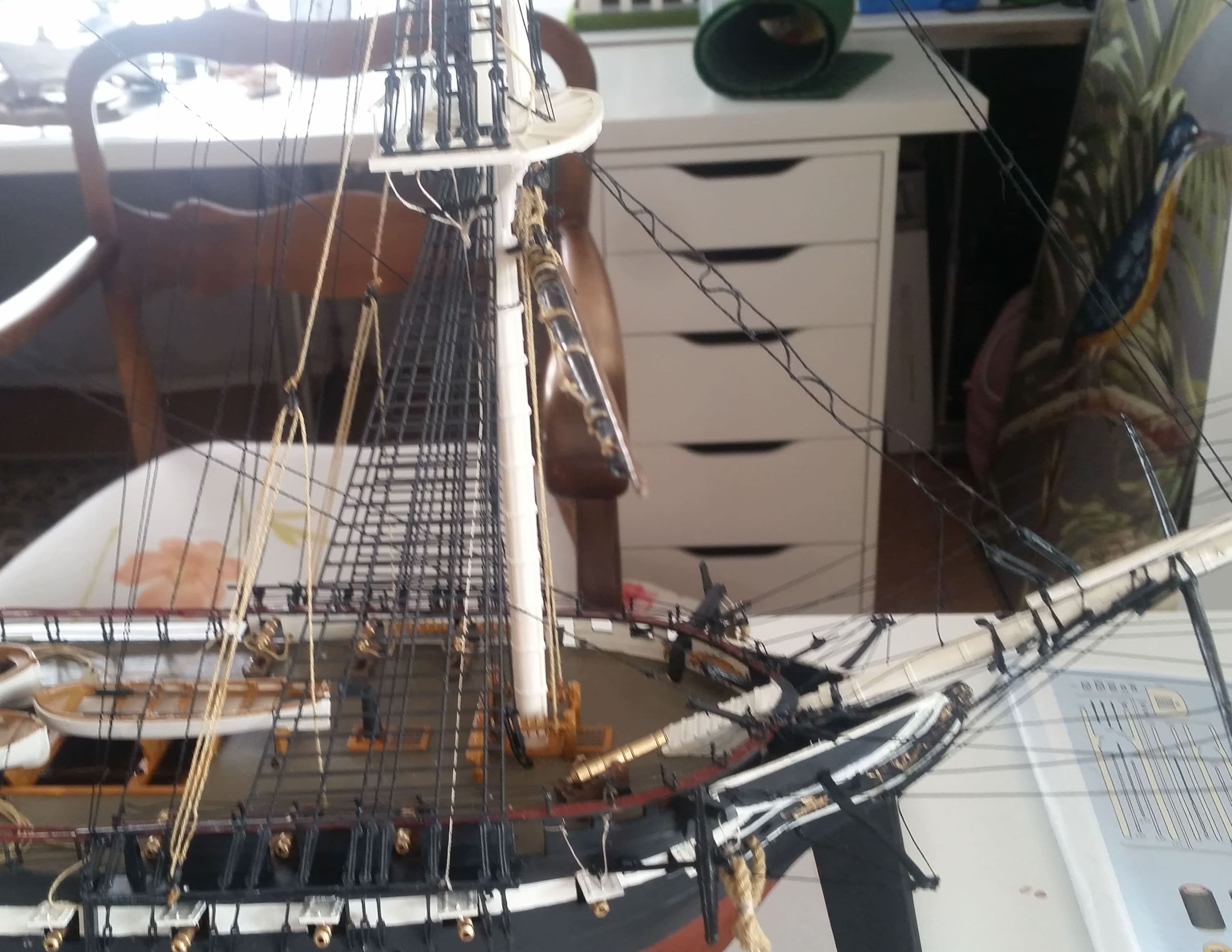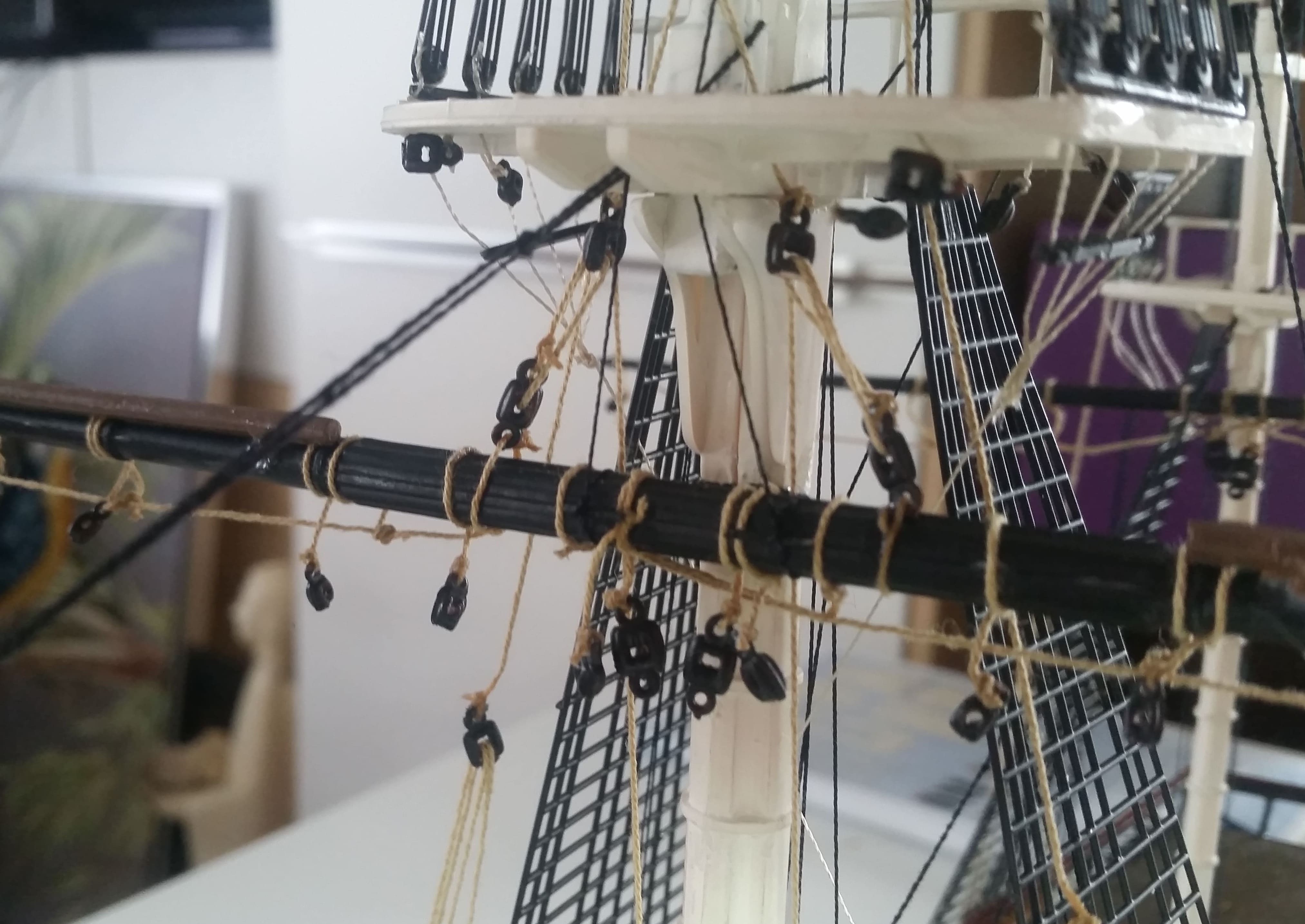 Jetzt können die einzelnen Rahen heraufgezogen und heruntergelassen werden. Eine Fummelei bei der ich mich frage, ob dabei schon jemand in die Anstalt eingeliefert werden musste :lol: Zwischendurch muß ich den Faden immer wieder aus der Hand legen sonst bin ich nicht konzentriert genug und komme an die anderen Taue, die dann Teile verbiegen oder abreissen könnten.
