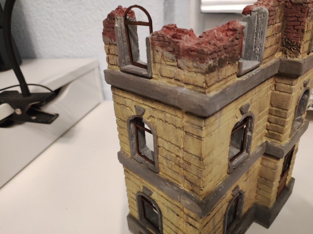 Dann wurde das Haus gebaut und Lackiert. Vorallem am Übergang musste ich mit Gips spachteln. Dann das wichtigste, das Haus wurde mit steingrau trocken gemalt und mit einem Wash versehen