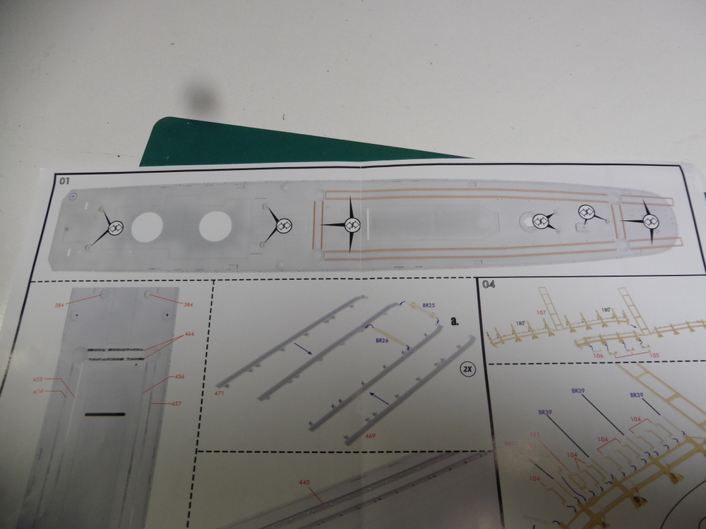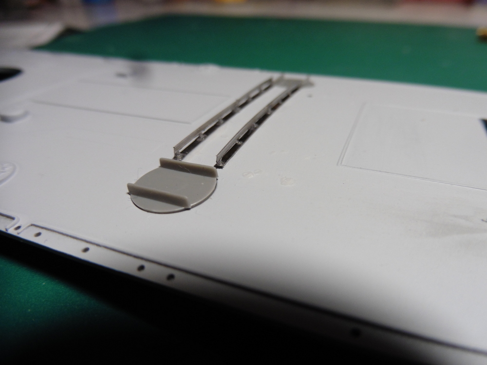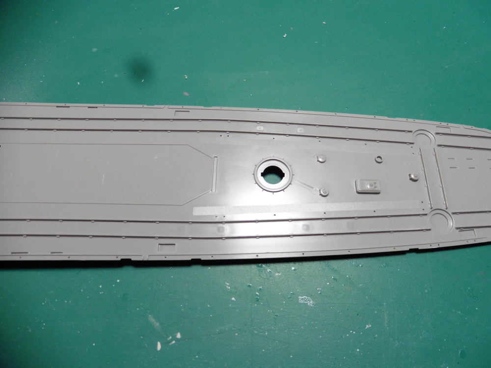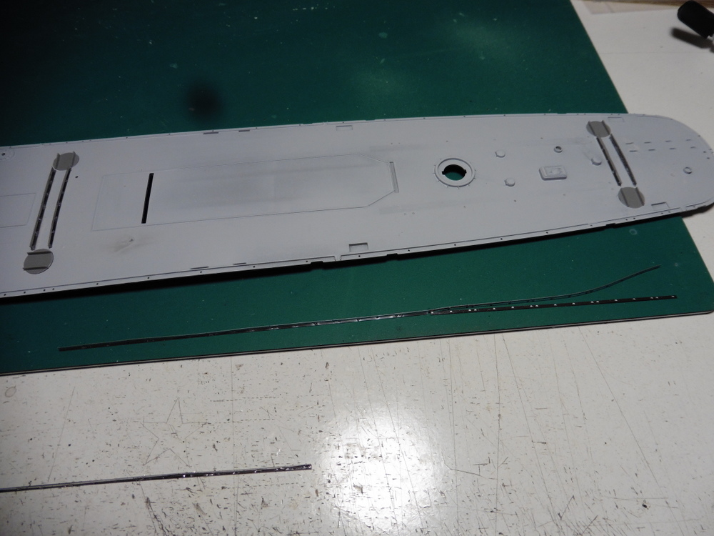Als nächstes ging es um das Deck . Hier ist ein Schienensystem für die Minen . Die Plastikschienen müssen laut Ätzteilplan entfernt werden . Grobes Abschälen und dann viel Schleifarbeit waren von nöten .