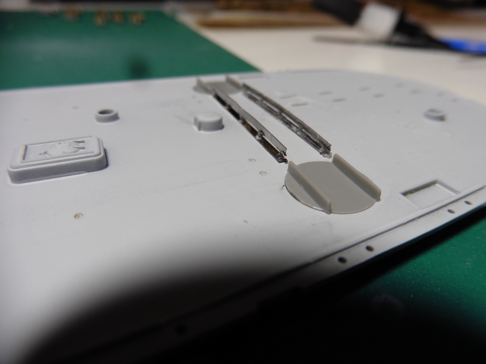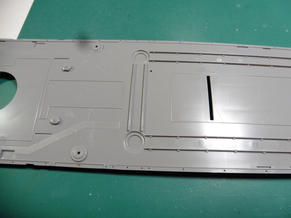 Wie vorher schon geschrieben , Schleifen und Bauteile entfernen . Tja hab ich ja auch gemacht , war aber glaube ich eine blöde Idee . Das Schienensystem für die Minen sollte ja entfernt werden und durch Ätzteile ersetzt werden .