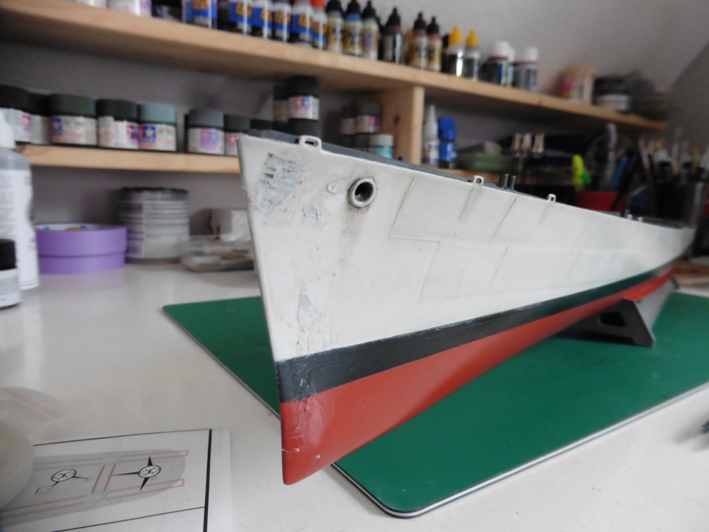 Habe jetzt gerade die Decals aufgebracht ( Wappen / Wasserstand ) . Also ein kleinen Tuppertopf mit etwas lauwarmen Wasser ein spriter Essig... Decals gehen ganz geschmeidig vom Träger . Dann einen Tropfen Decalsoft damit das Decal sich sauber an den Rumpf anlegt . So wie immer halt ... nun ja