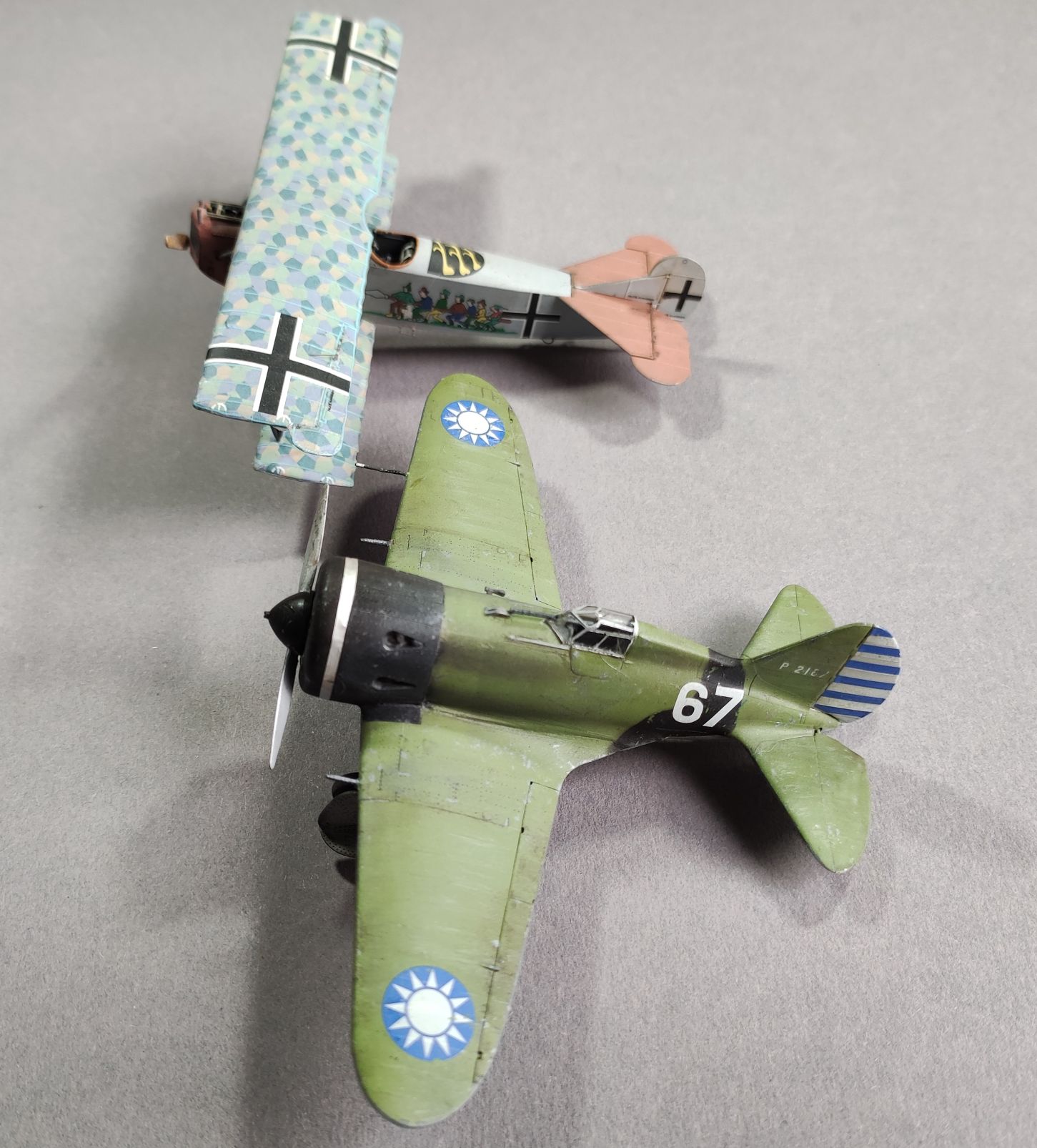 Die Sowjetunion stand den chinesischen Kommunisten recht nahe. Als Japan China überfallen hat begann ich China eine Art Burgfrieden und die verfeindeten Klans arbeiten zusammen, um die Japaner wieder aus dem Land zuwerfen. Kurz nach Ausbruch des Kriegs 1937 unterzeichnete China und die UDSSR einen Nichtangriffspackt, der auch eine Art Defensivbündnis darstellte. Nur wenige Tage nach der Unterzeichnung trafen bereits erste sowjetische Jäger für China ein. Hierbei handelte es sich überwiegend um I-152, I-153, I-16 und Bomber vom Typ SB-2 und TB-3. Es sollten im Laufe des Kriegs 848 Flugzeuge werden. Des Weiteren entsendete man aber auch je ein Jäger- und ein Bombergeschwader mit insgesamt 37 Flugzeugen aus Freiwilligen Piloten. Als 1941 der Überfall auf die Sowjetunion begann, zog man die Piloten aus China ab. Zum Größenvergleich noch zwei Bilder meiner Letzten Jagdflugzeuge.
