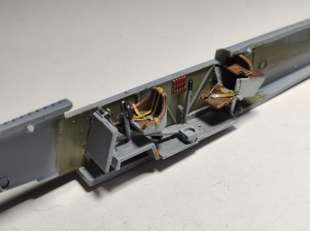 Weiter ging es mit dem Innenraum. Auf einer kleinen PE-Platine liegen Gurte bei, die ich nun auch angebracht habe, man darf hier die Größe nicht unterschätzen, jeder der schon Mal ein Doppeldecker aus dem ersten Weltkrieg gebaut hat, kennt die Größe des Flugzeugs