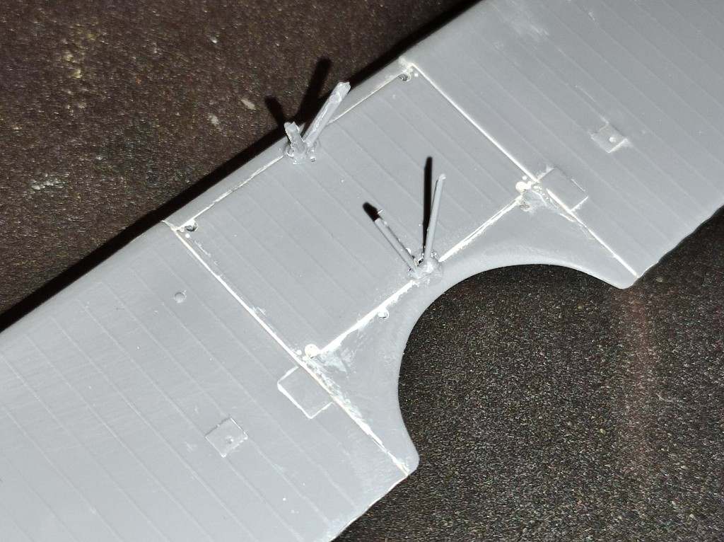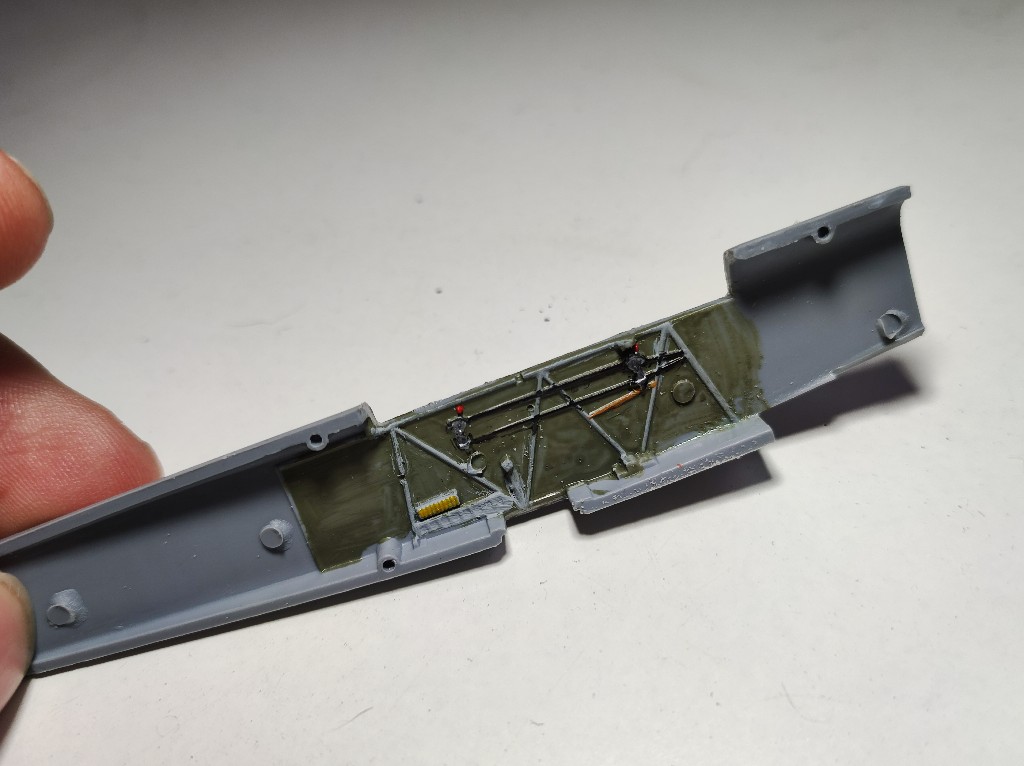 Hier mussten die Spalte auf alle Fälle ordentlich verschlossen werden. Auf der Unterseite sind bereits die Löscher für die Streben zu sehen, die später den Oberflügel mit dem Rumpf verbinden.