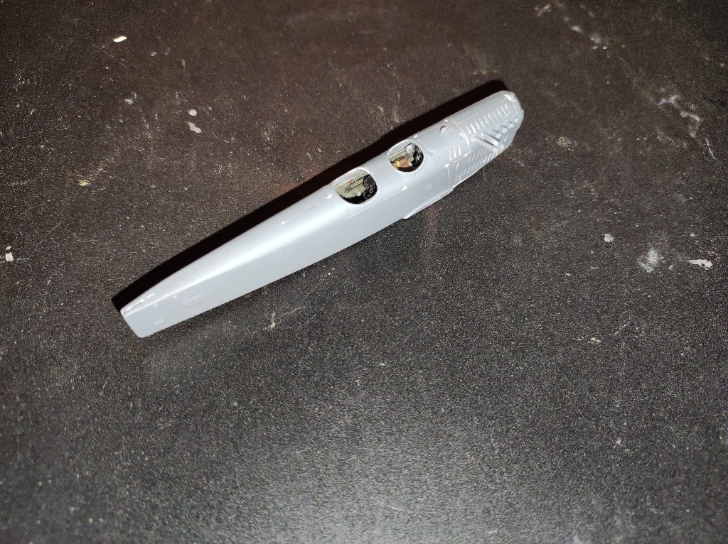 Neben den beiden Rumpfteilen, musste auch die Sektionen mit den beiden Löschern für die Piloten eingesetzt werden. Die Passung war okey, man sieht hier schon dass ich bereits ordentlich geschliffen habe. Die Spalte waren nicht so extrem groß. Leichter Versatz gab es am Rumpf