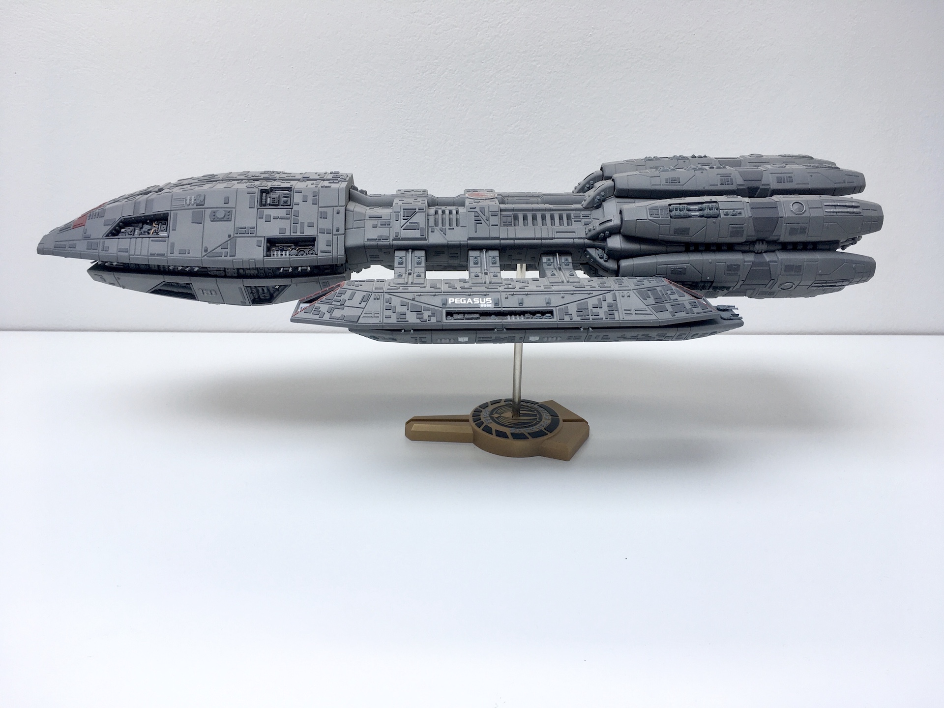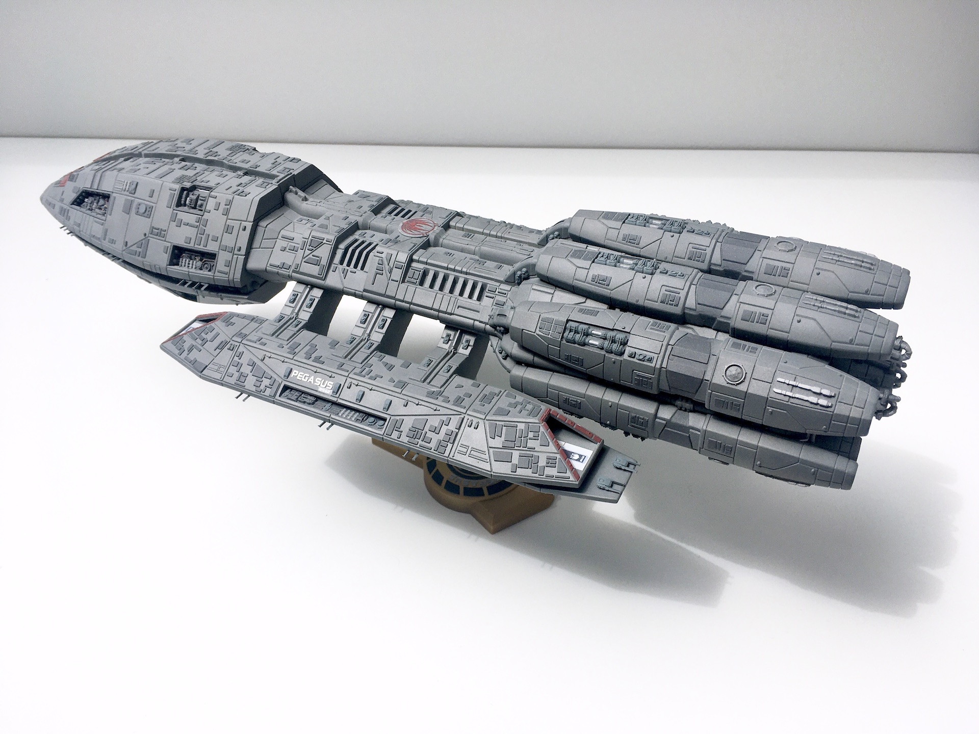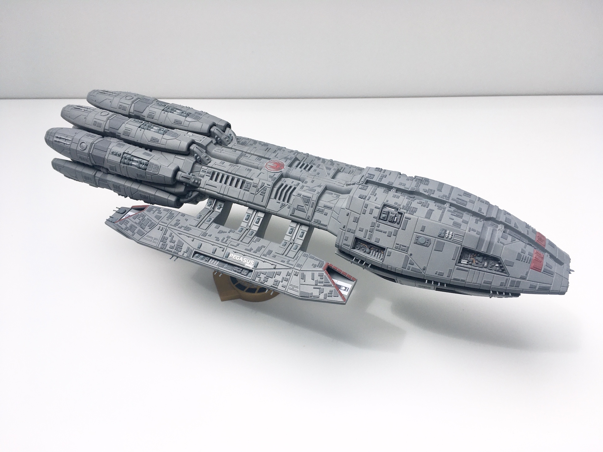Meine „Battlestar Pegasus“ aus der 2005er Science-Fiction Serie „Battlestar Galactica“. Der Bau ist schon etwas her aber soweit ich mich erinnern kann war er aufgrund der geringen Teileanzahl nicht sehr kompliziert. Die Lackierung der vielen kleinen Hüllenplatten hingegen hat etwas gedauert. Das Modell ist ca. 43cm lang und somit fast 10cm länger als das Modell der „Galactica“ im selben Maßstab.