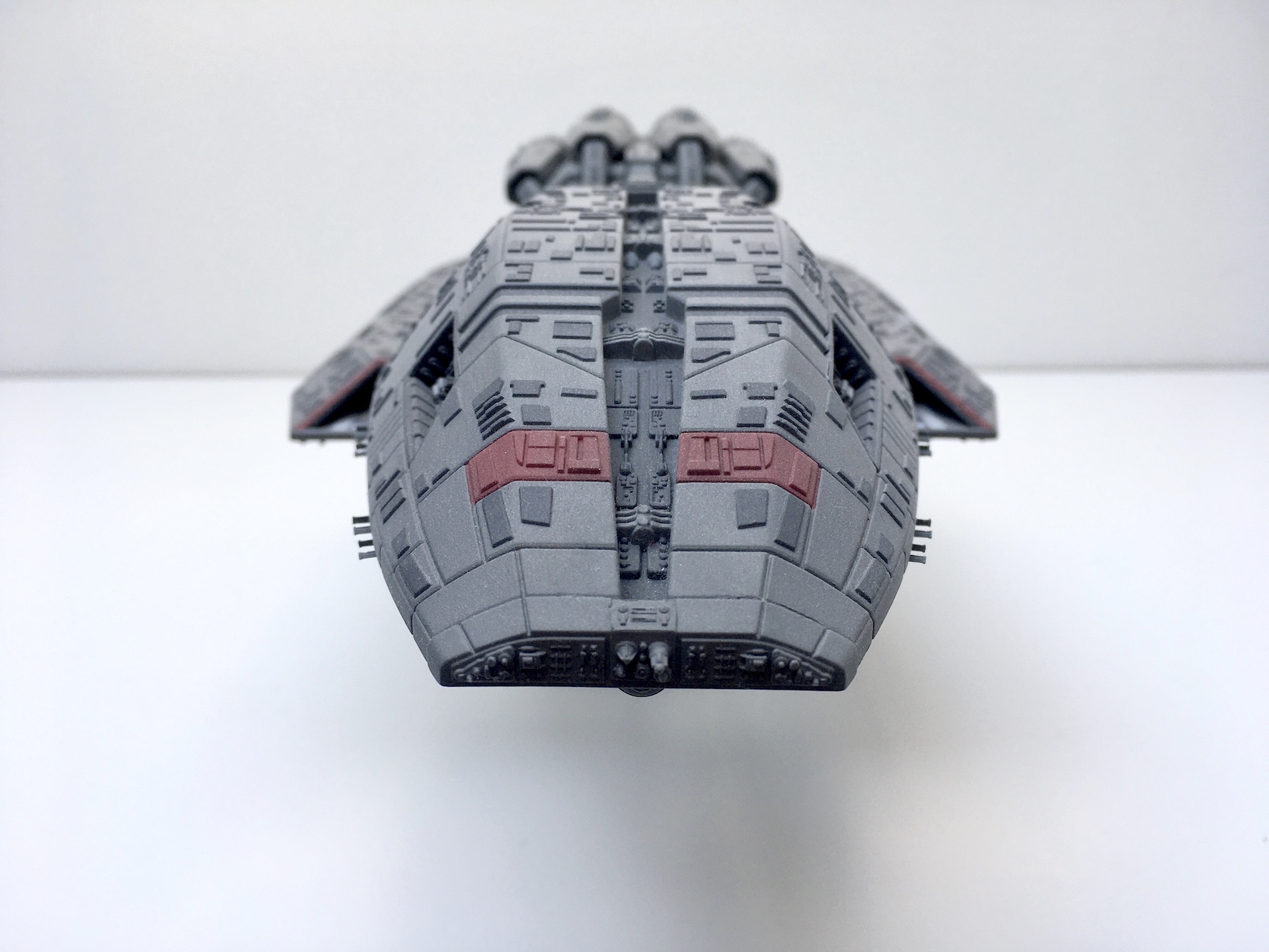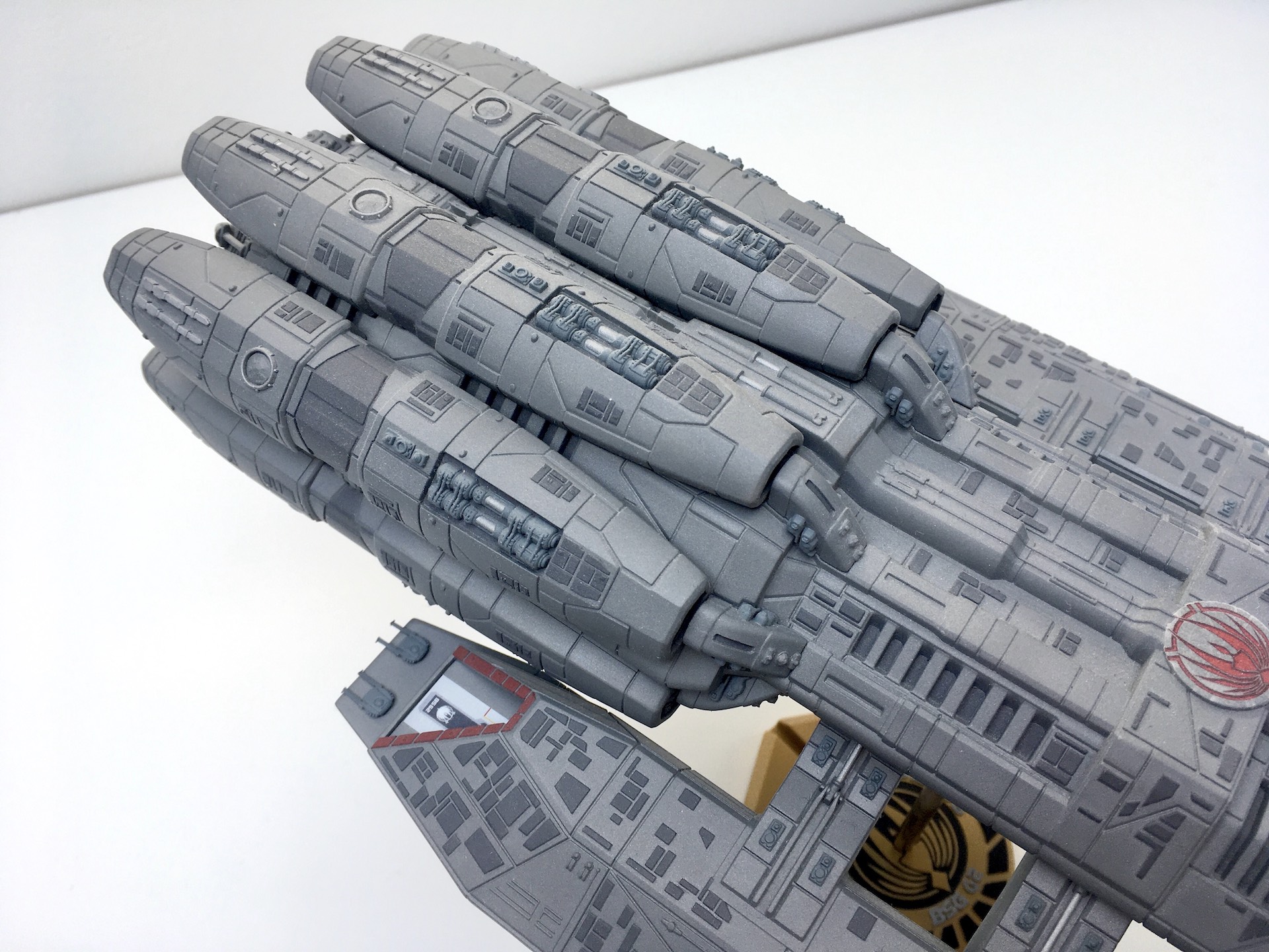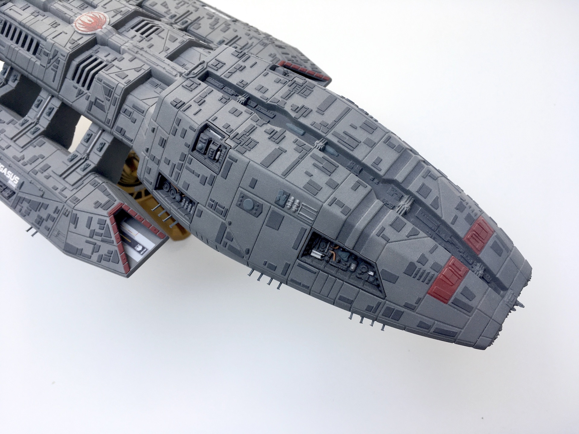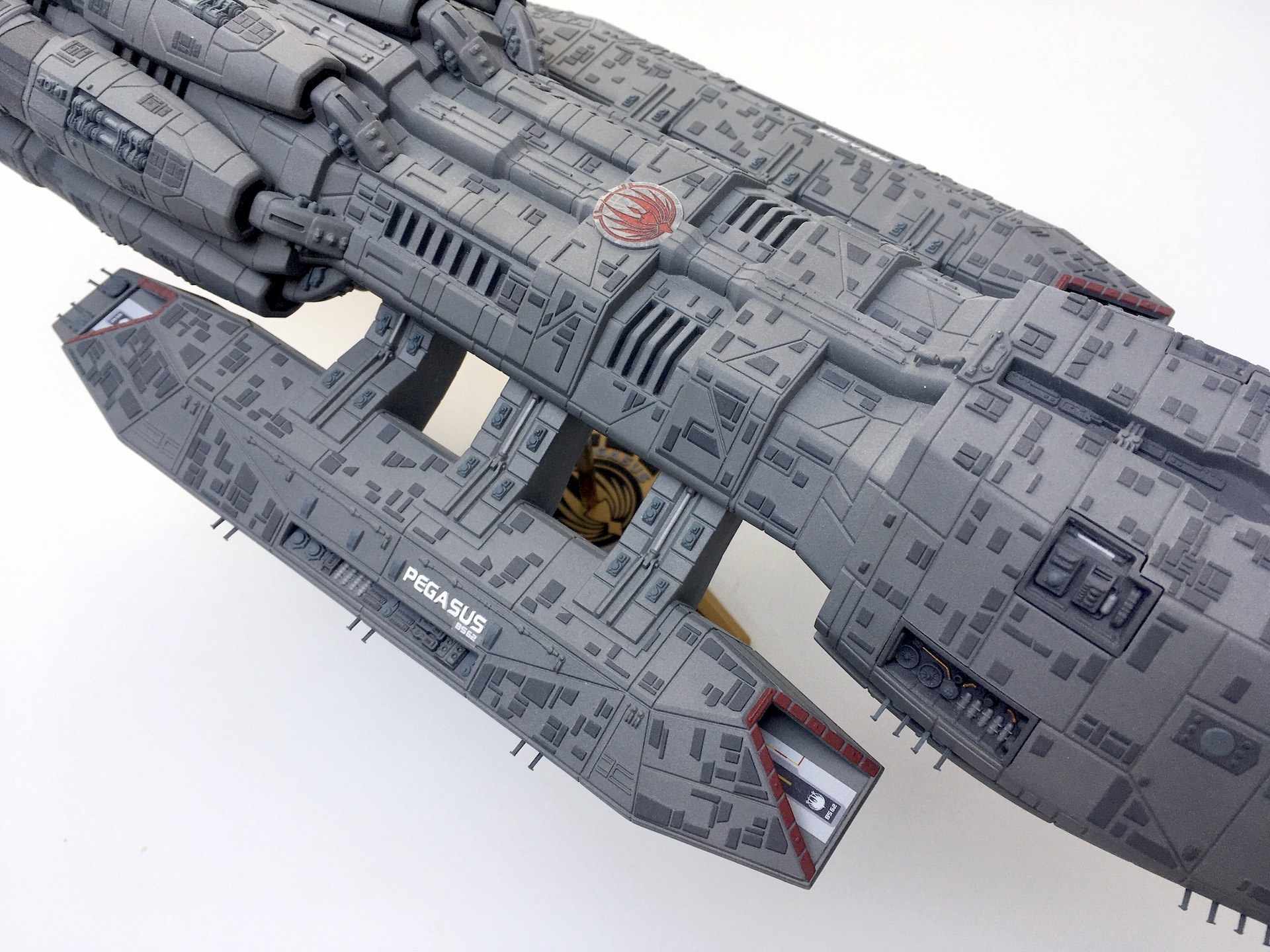 Meine „Battlestar Pegasus“ aus der 2005er Science-Fiction Serie „Battlestar Galactica“. Der Bau ist schon etwas her aber soweit ich mich erinnern kann war er aufgrund der geringen Teileanzahl nicht sehr kompliziert. Die Lackierung der vielen kleinen Hüllenplatten hingegen hat etwas gedauert. Das Modell ist ca. 43cm lang und somit fast 10cm länger als das Modell der „Galactica“ im selben Maßstab.