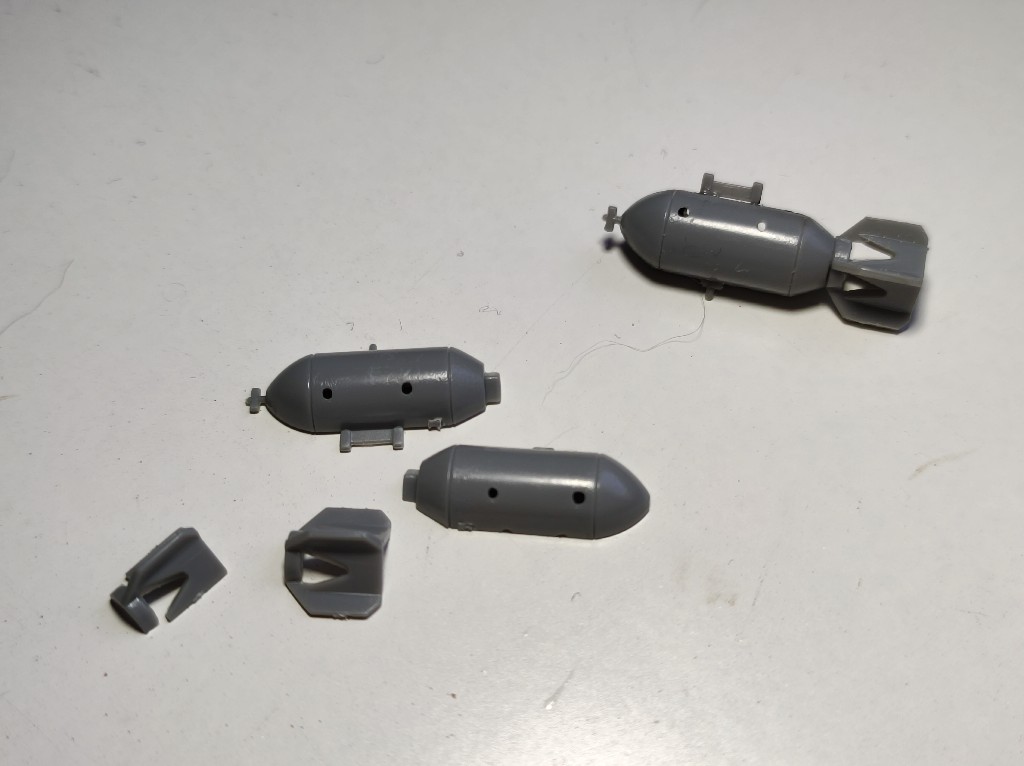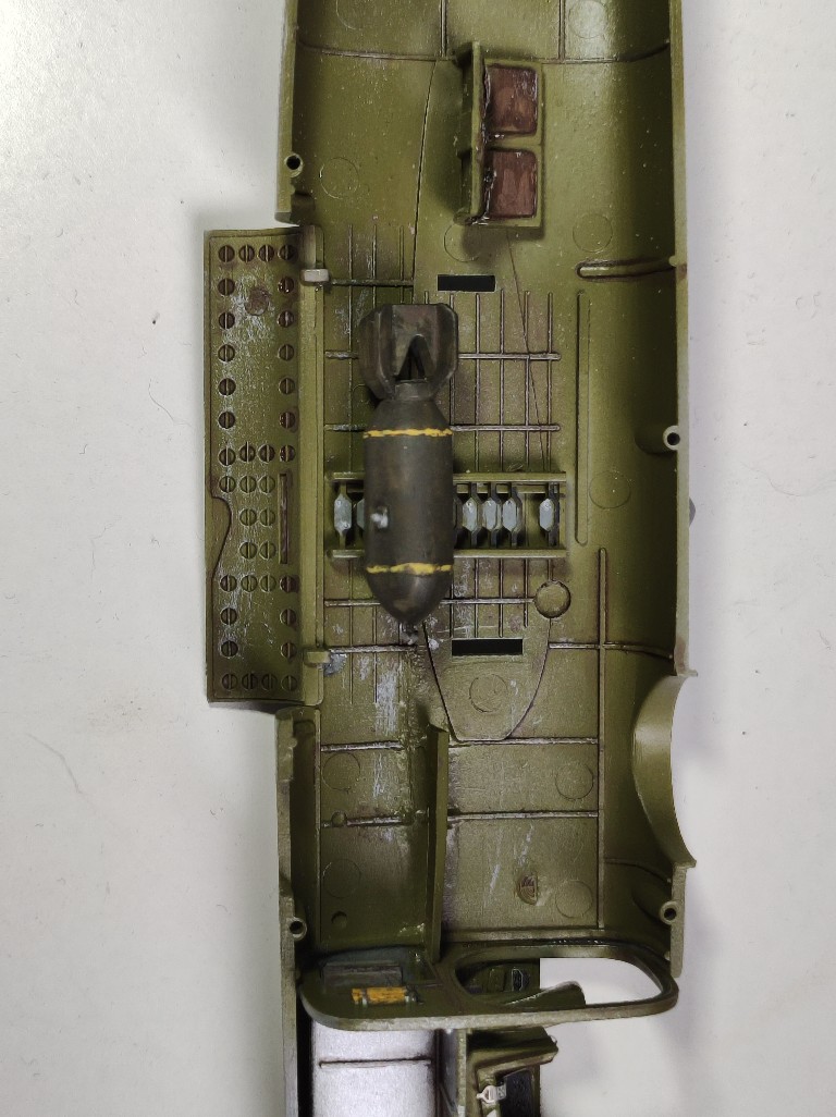 Der Flieger kann nur zwei Bomben aufnehmen, weil der Bausatz nicht mehr mitliefert. Das ist aber auch ausreichend, andernfalls, würde man vom Bombenschacht nichts mehr sehen.