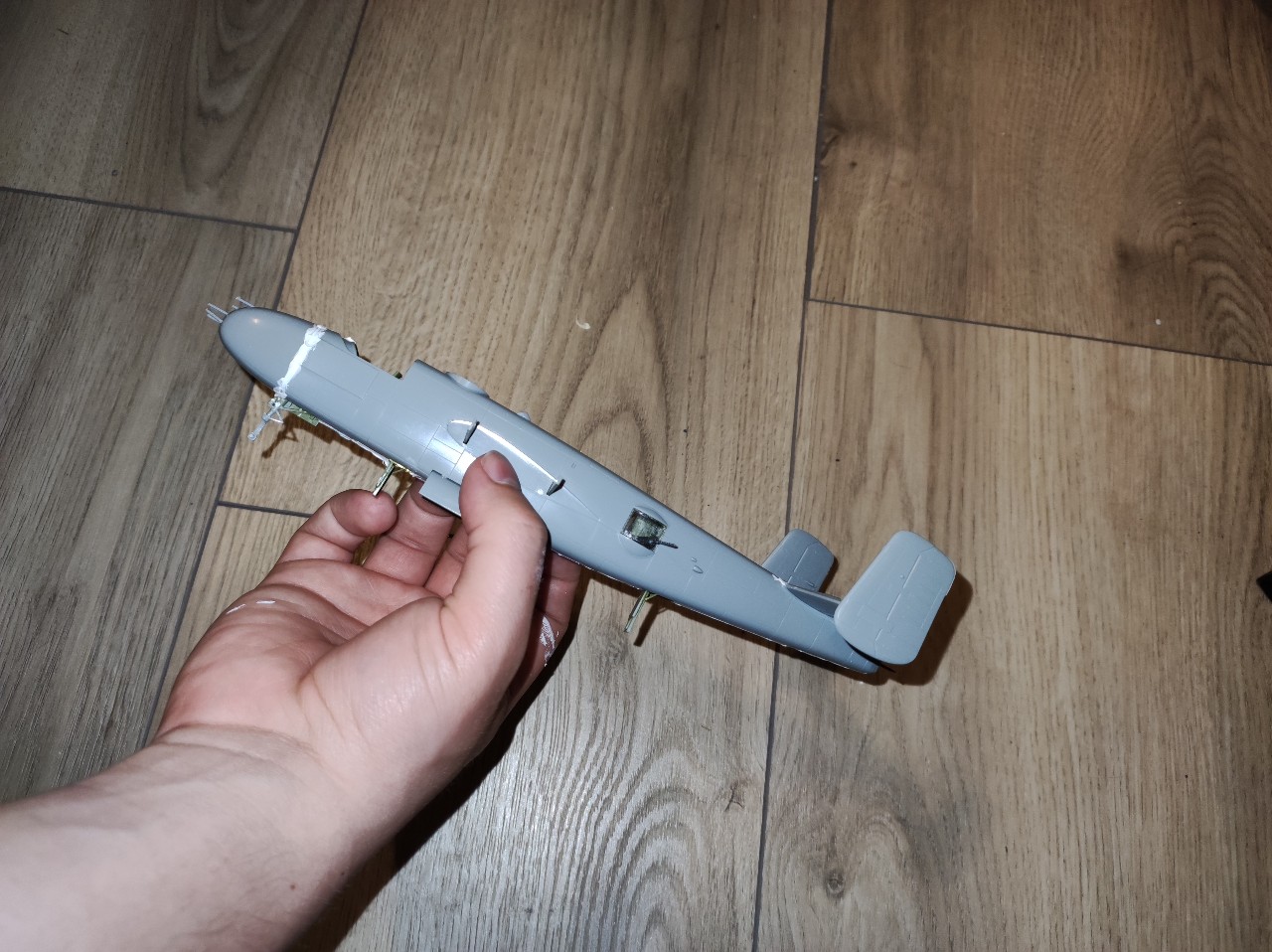 Der Arbeitsplatz der Piloten. Wie auch der Bombenschacht eine Art Segment. Hier sehen wir unter anderem den Tunnel in den man in den Bug gelangt. Außerdem sieht man den Fahrwerksschacht. Das ganze ist bereit zum Lackieren.