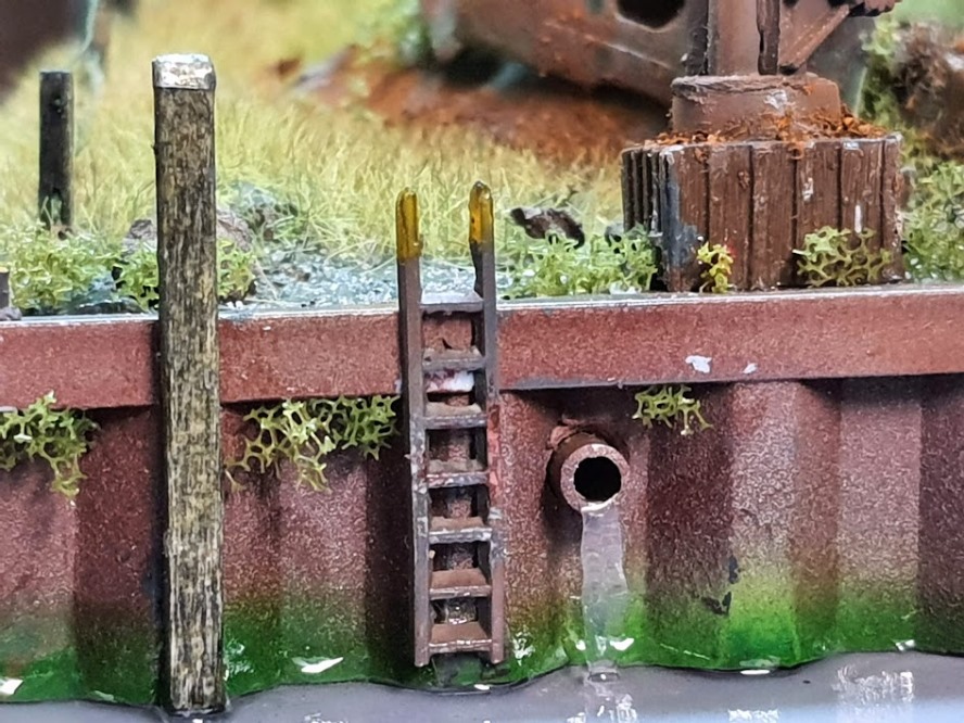 Was gut funktionierte war die Darstellung des Wassers, das aus dem Rohr läuft. Still Water auf eine glatte Oberfläche pinseln, nach dem trocknen mit dem Skalpell abheben, im Rohr und auf der Wasserfläche mit Still Water antupfen, fertig.