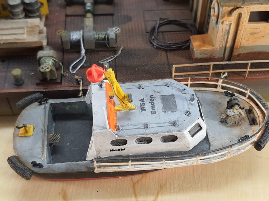 Arbeitsboot „Hecht“ des WSA Emden. Dies Modell entstand aus den Resten eines DGZRS Rettungskreuzers, den ich etwa 1994 gebaut hatte. Leider wurde dieses Modell bei zwei Umzügen zerstört, übrig blieb nur das Tochterboot. Bei dem Versuch das Modellchen zu entlacken habe ich dann auch noch den Aufbau zerbrochen. Dank Abt. X konnte ich sogar noch Ersatz bekommen. An dieser Stelle noch mal danke dafür!