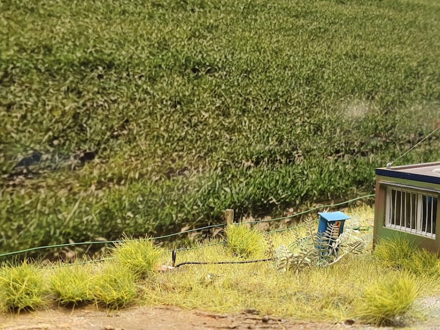 Das Gras ist drauf. Der Versuch mit der Schüttelflasche verlief nicht so wie erhofft. Zum Glück ist ein Freund in einem Eisenbahnclub und konnte von dort ein elektrisches Gerät ausleihen. So sieht es deutlich besser aus.