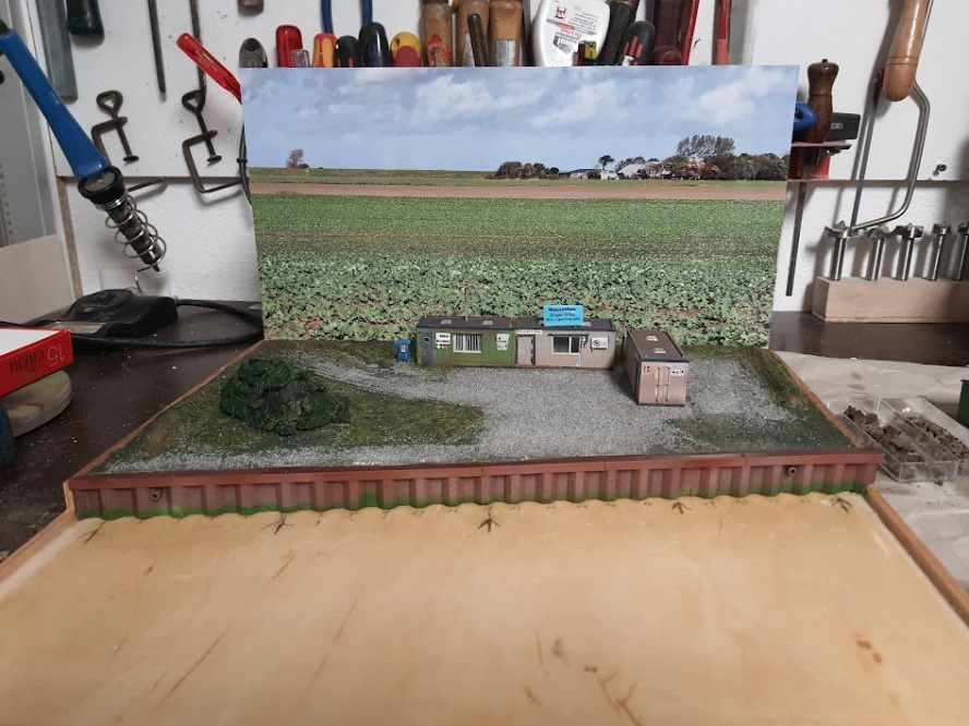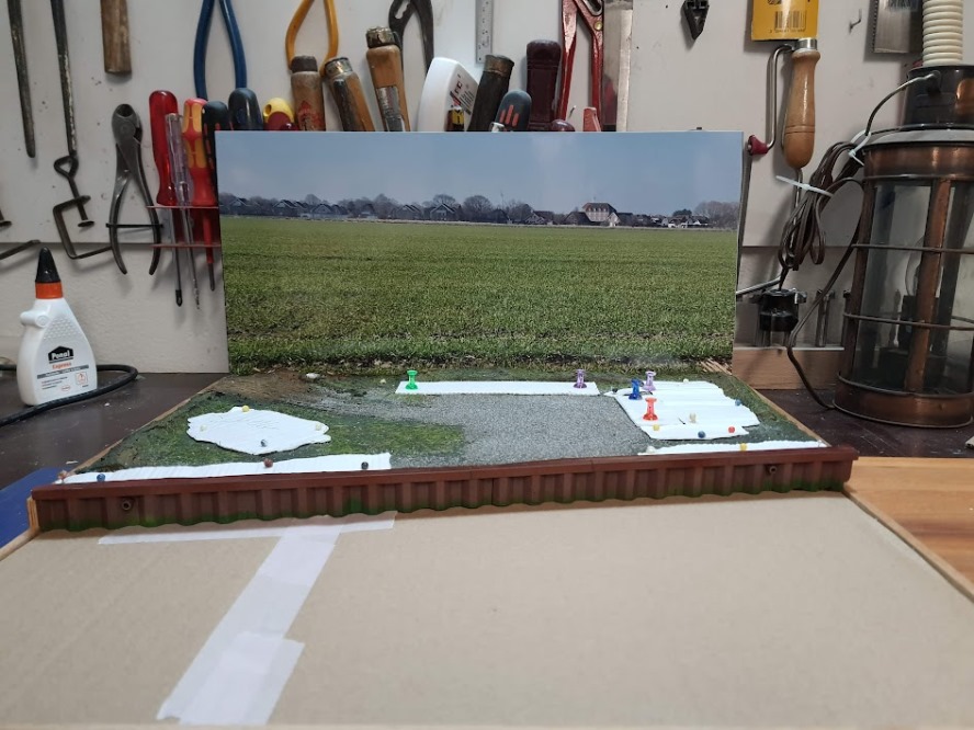 Es geht an´s begrasen.Es soll statisches Gras verwendet werden. Die Flächen, die nicht begrast werden sind mit Papp Masken abgedeckt. Das Hintergrundbild ist neu und passt deutlich besser.