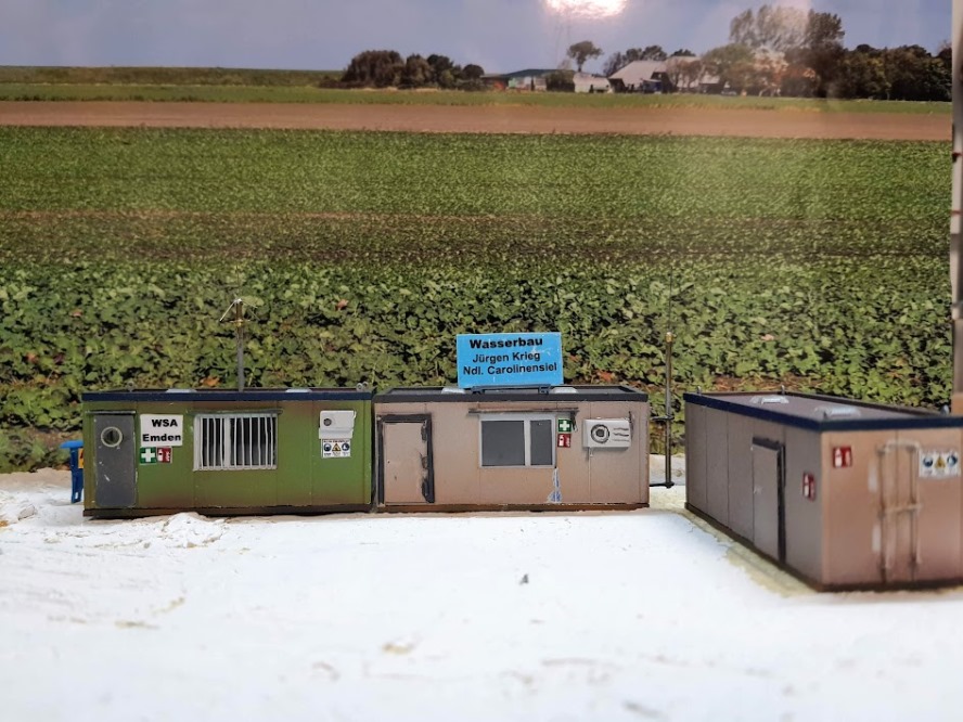 Das Baubüro des WSA Emden. Auch dieser Container erhielt eine neue Tür und Gittervor den Fenstern. Die Gitter sind aus 0,3 mm Silberdraht gebogen. Baustellen Typische Warnhinweise und Hinweisschilder sind aus dem Netz heruntergeladen und entsprechend verkleinert.