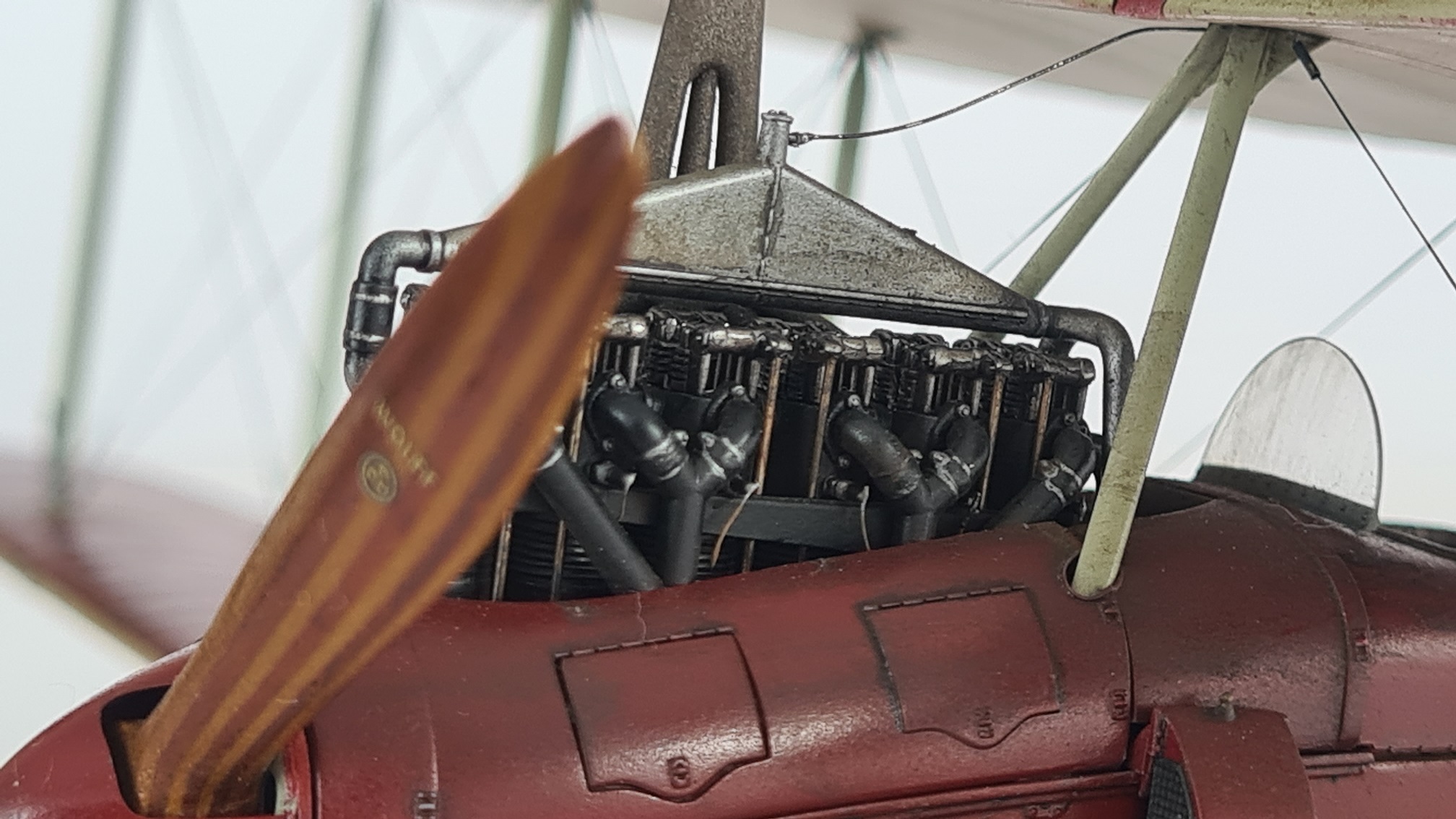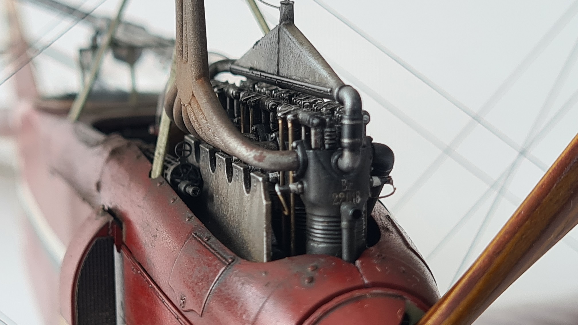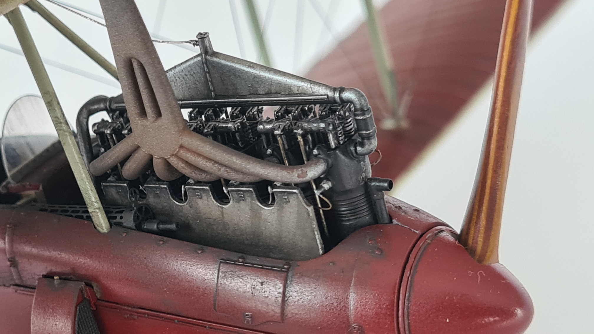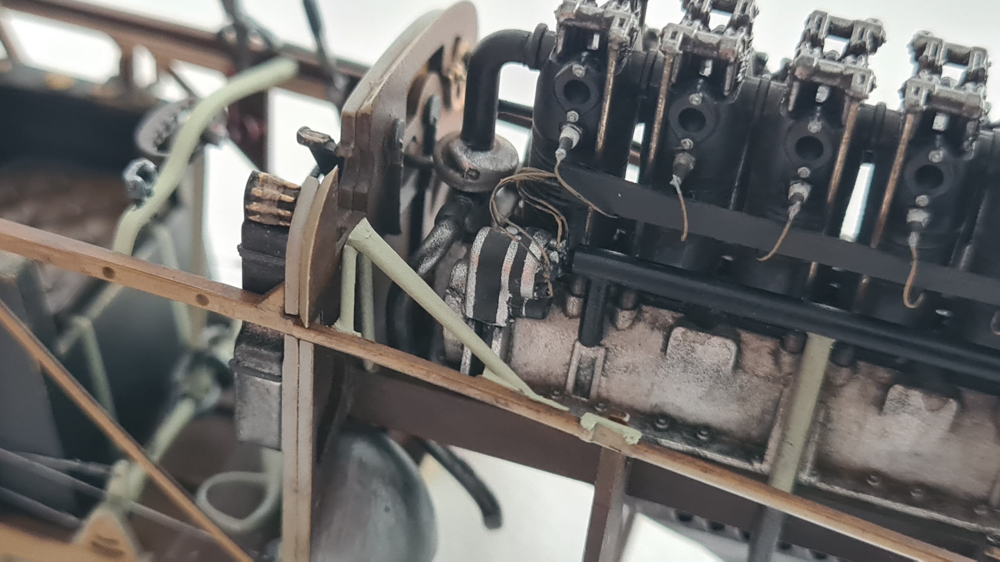 Der Motor brauchte extra Aufmerksamkeit, da hier einige Details fehlten. Die Ventilfedern mussten "nachgeschnitzt" werden, Zündkabelkanäle waren nicht vorhanden, Ventilstangen wurden scratch-eingebaut.