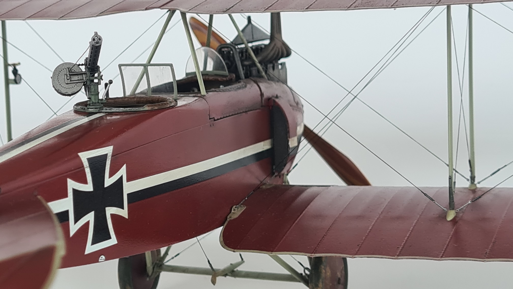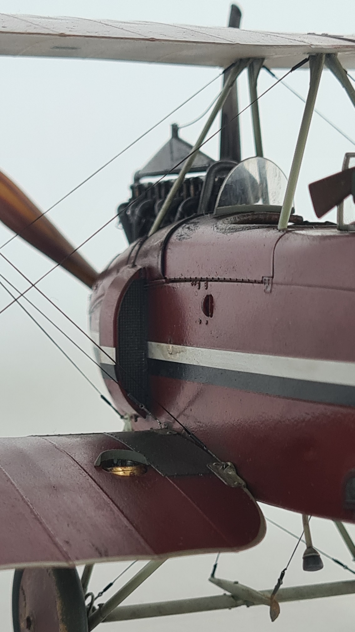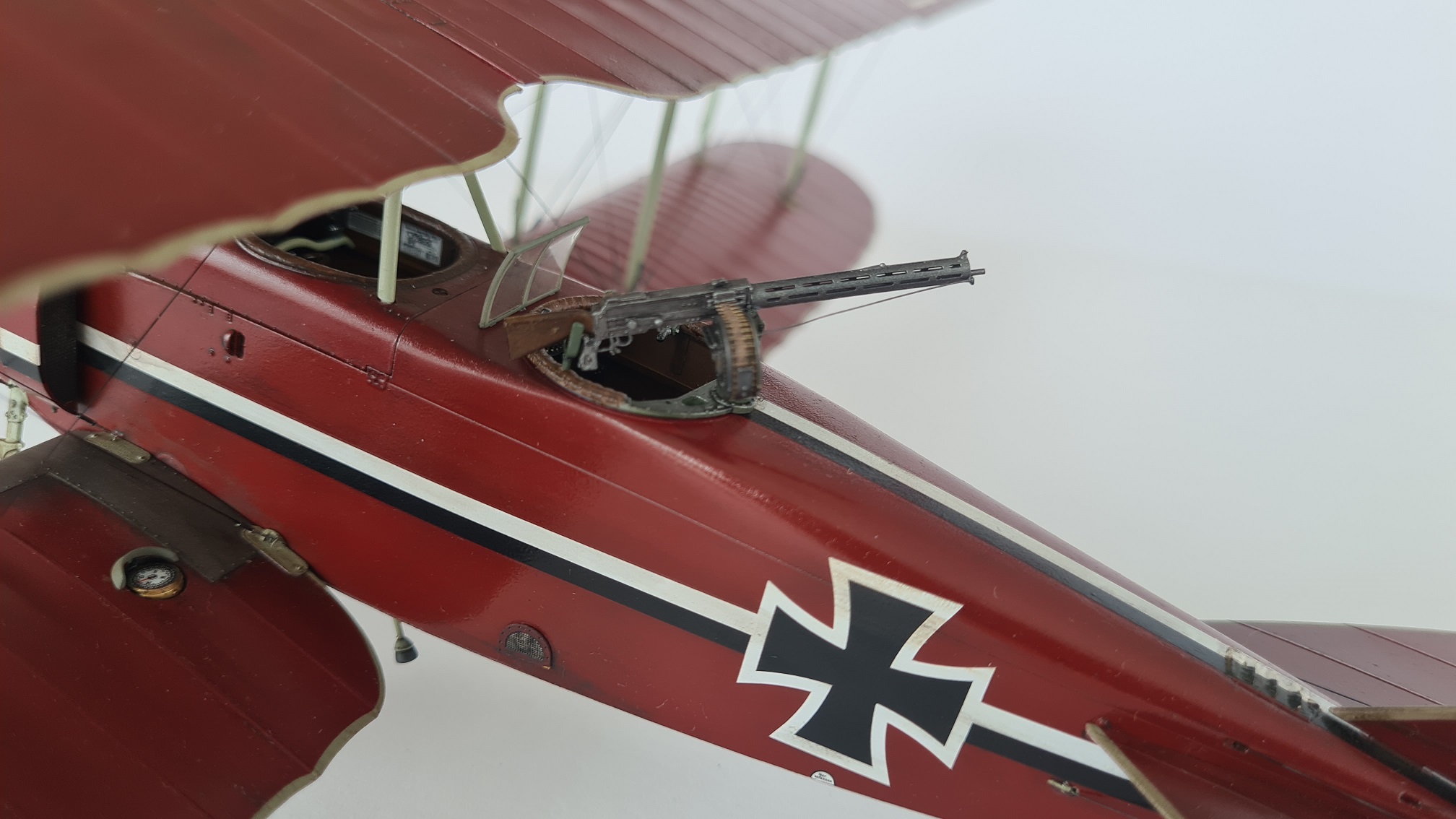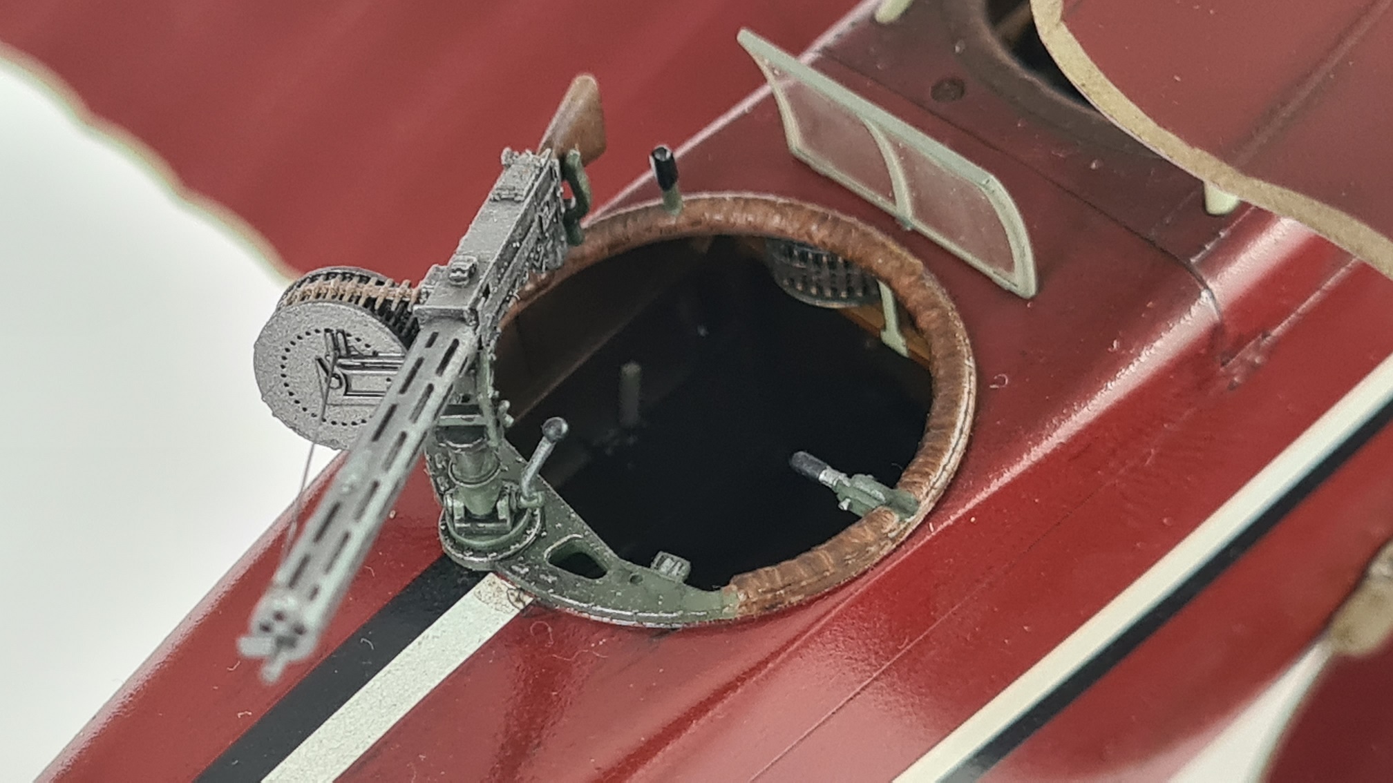 Was mich ebenfalls wirklich Zeit gekostet hat, war das Finden der passenden Farbe. Ich habe viel gemischt und experimentiert, bin dann aber am Ende bei AK11007 "Burnt Red" gelandet. Die Maschine sollte dabei (entsprechend historischer Fotos) glänzend sein. Für mich eine Herausforderung, denn sie sollte nicht frisch aus dem Werk kommen. Also irgendwie eine vernünftige Balance finden zwischen, glänzend und verschmutzt.
