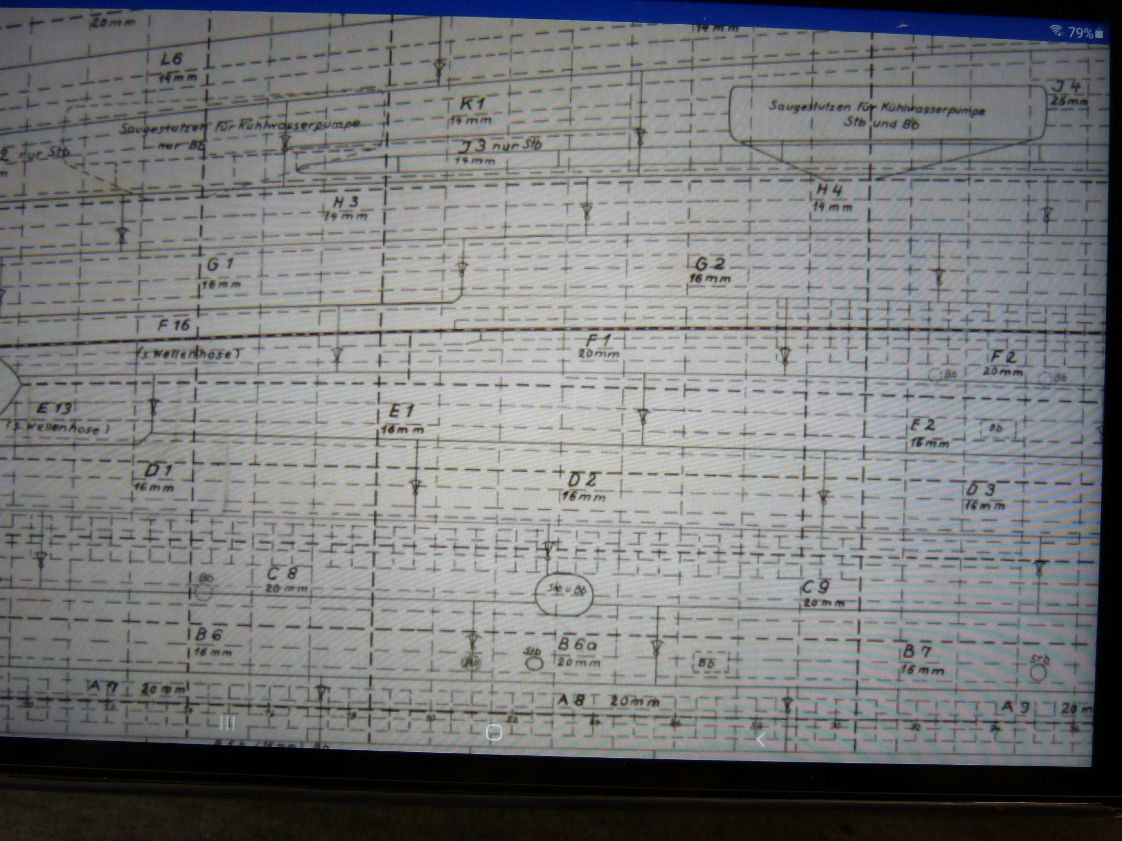 Hier sieht man nun, dass die „Saugestutzen für Kühlwasserpumpe Stb und Bb“ sich zwischen den Spanten 87 und 95 und der für Bb zwischen 70 und 78 befanden, und zwar unmittelbar über dem Schlingerkiel. Somit war klar: zwei an Backbord und einer an Steuerbord – im Prinzip wie bei SH.