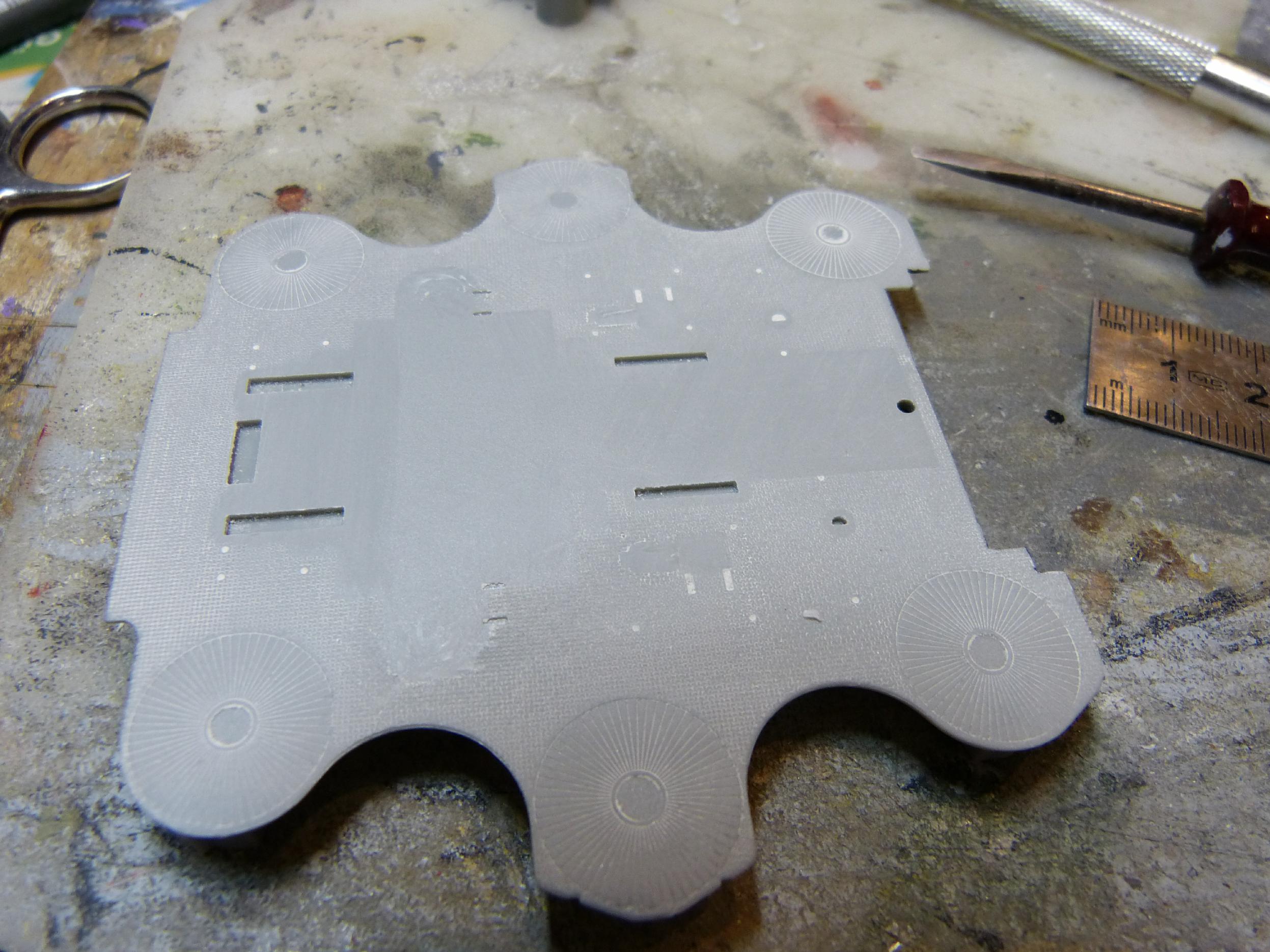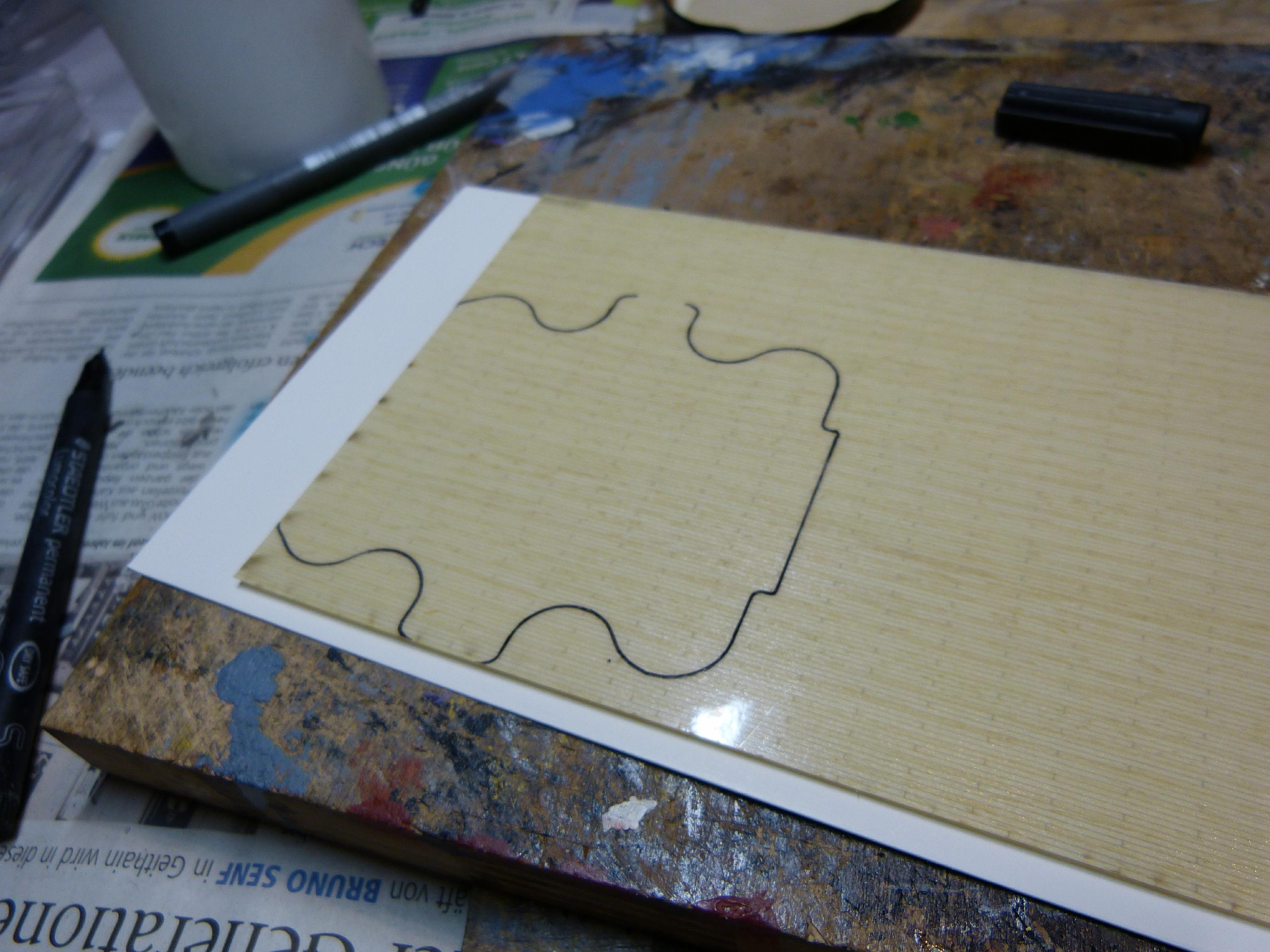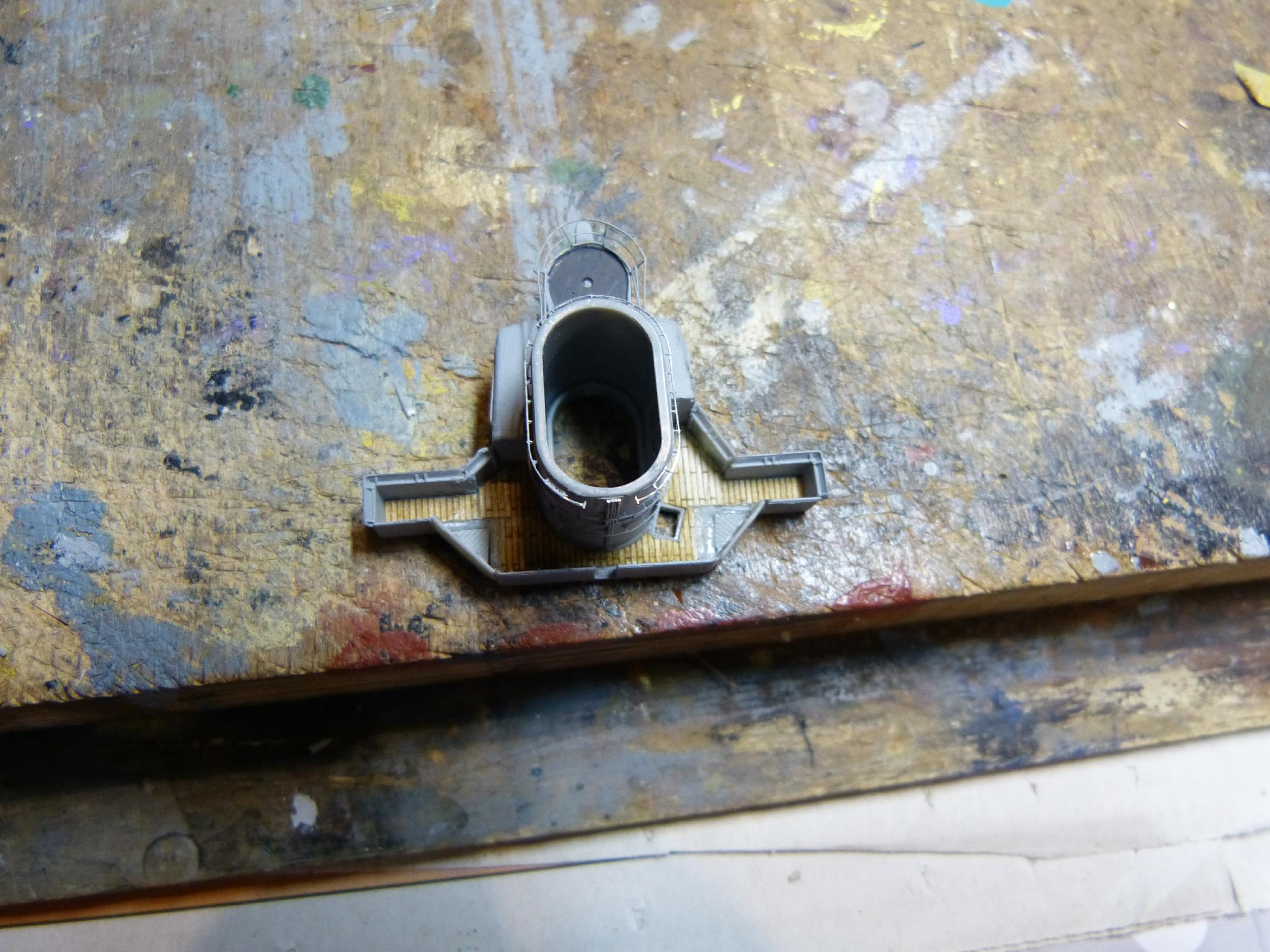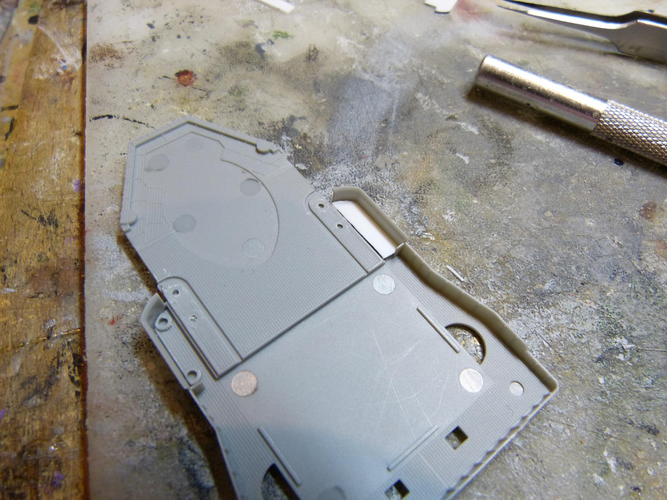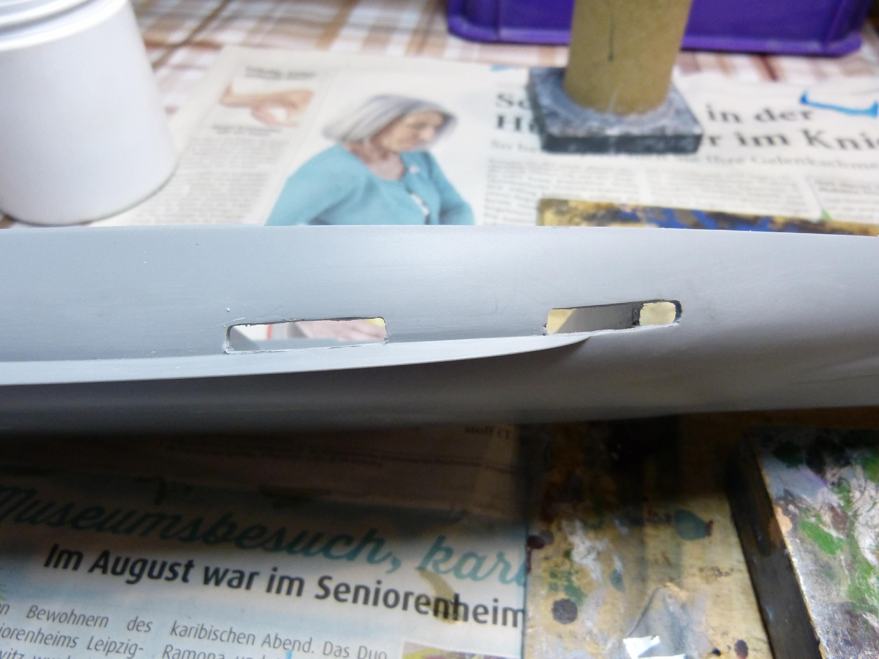 Nun grob Längen dünnen Plastiksheets (0,03 mm) zurechtgeschnitten, dabei jeweils eine lange Seite konisch angeschliffen (wie bei einem Messer). Dann übereinander geklebt und auf die passende Aussparung im Rumpf zurechtgeschnitten.