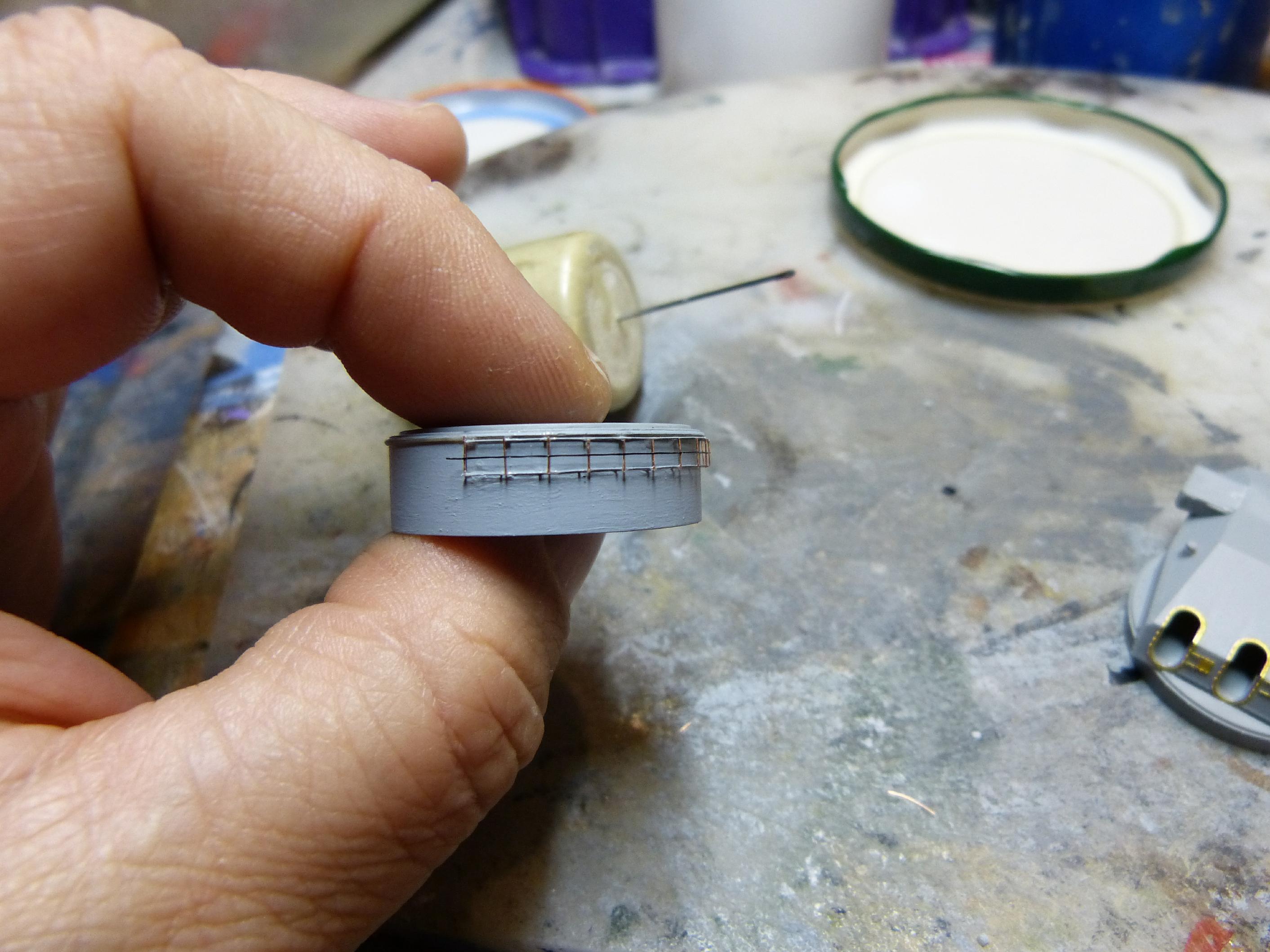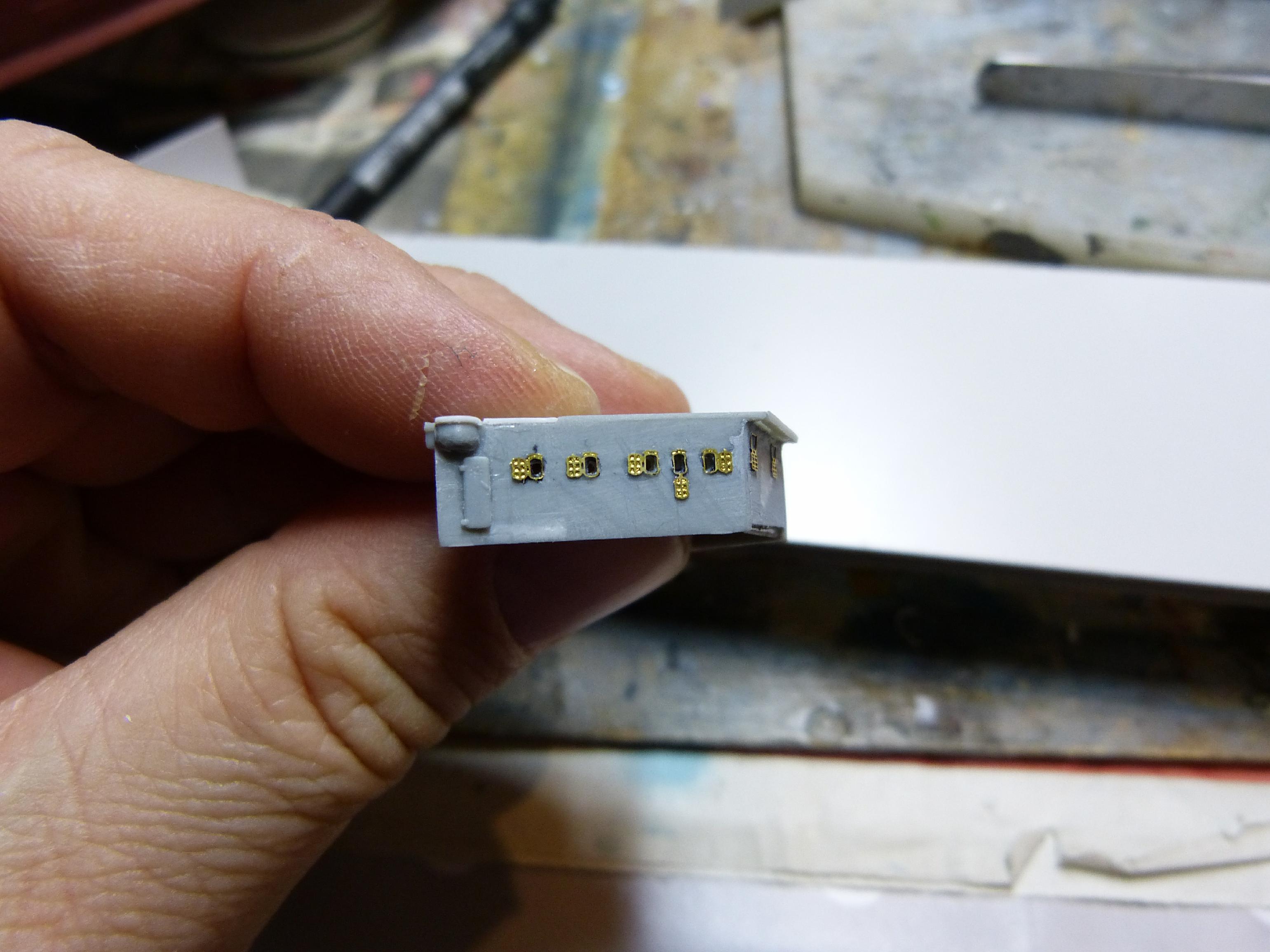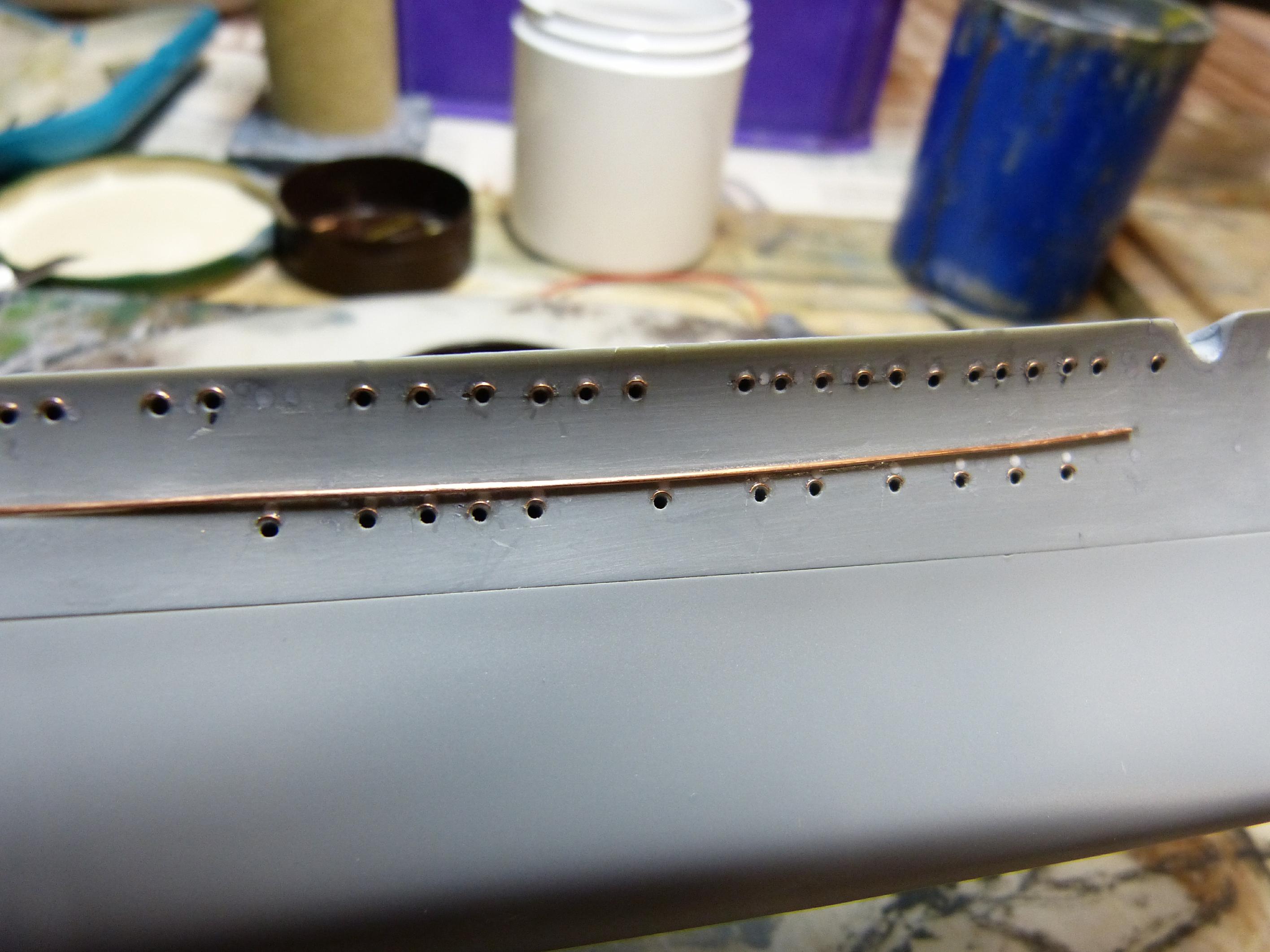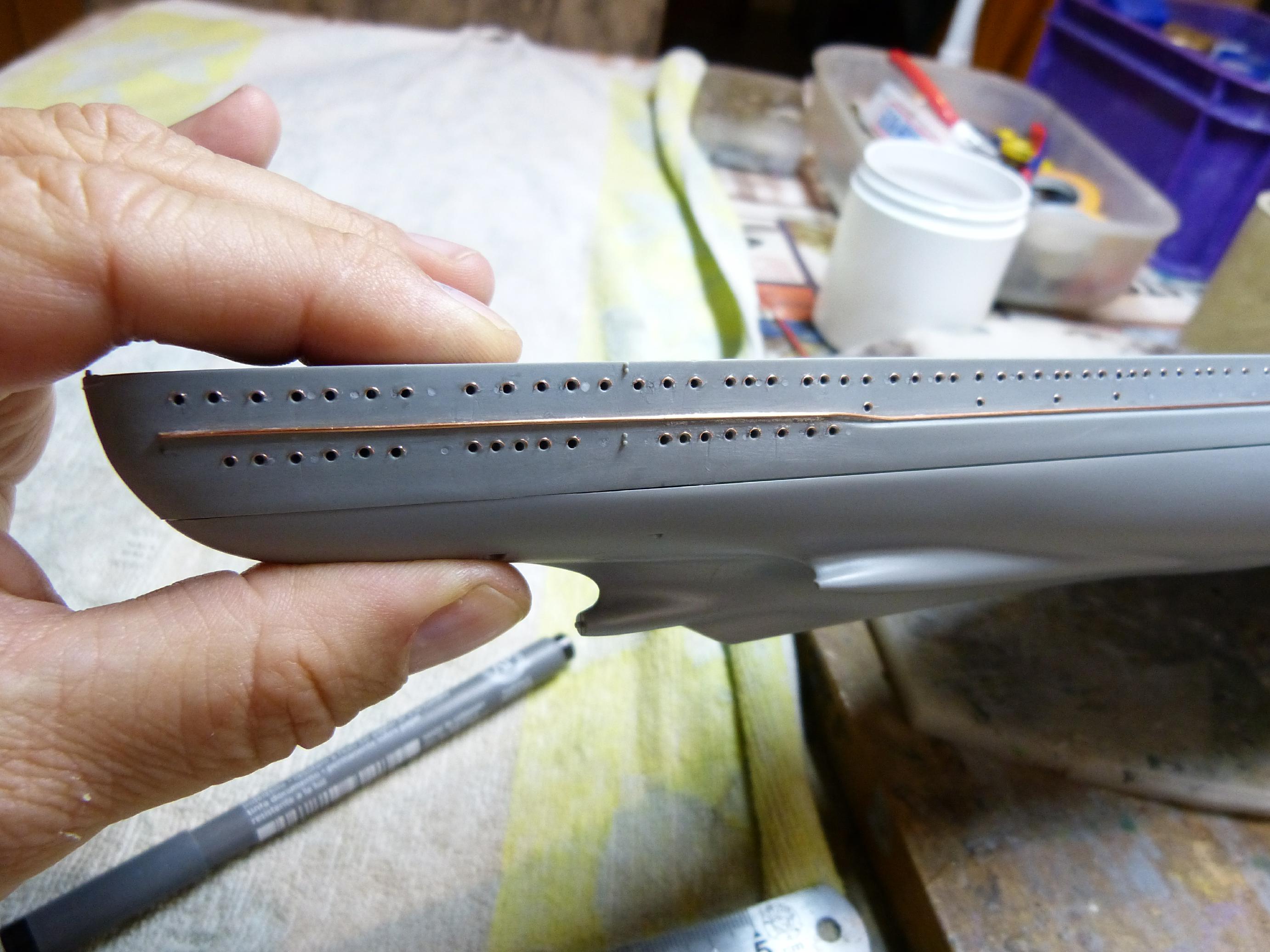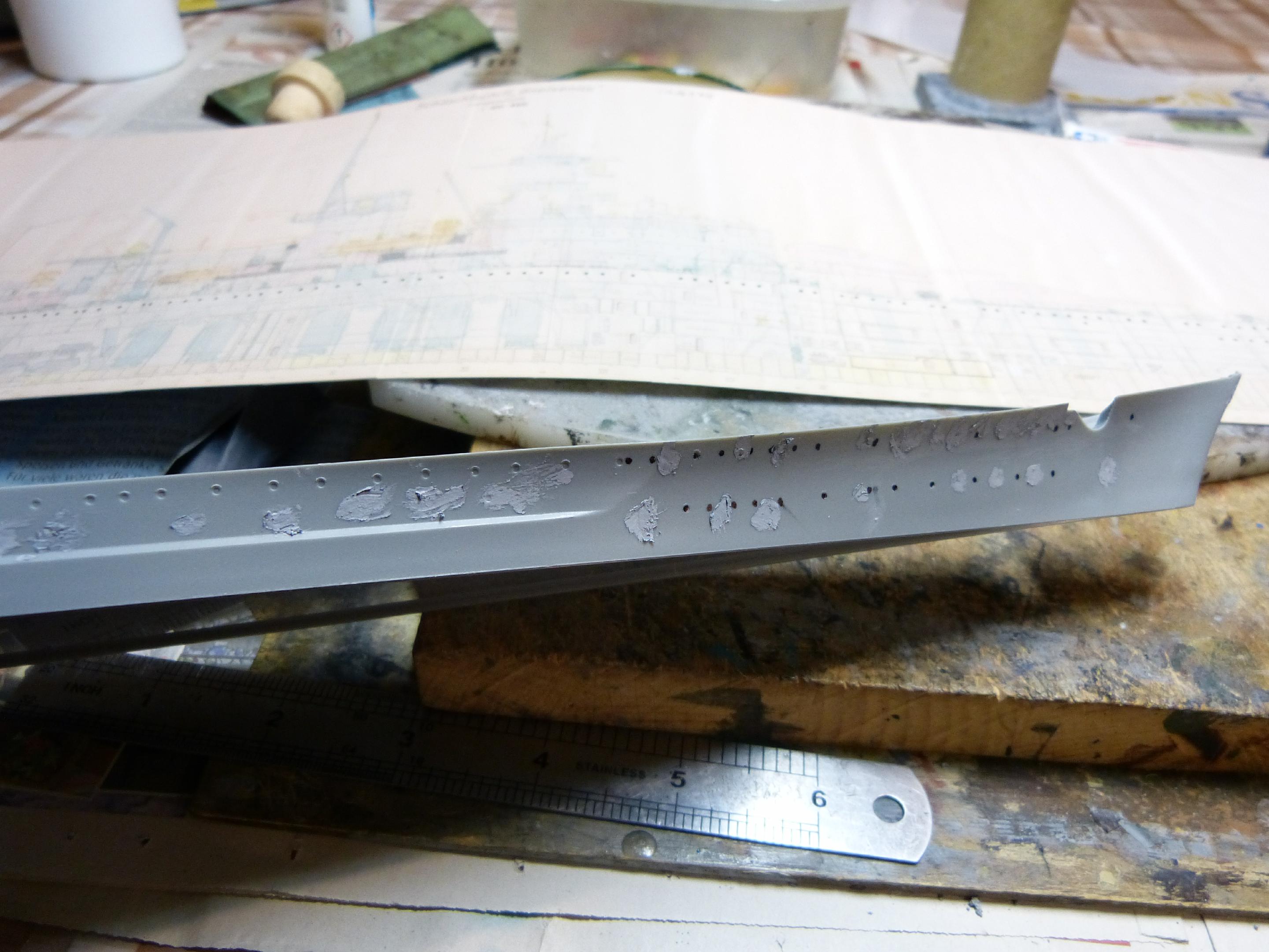 Da es leider dem Dragon-Unterwasserrumpf an jeglichen Details fehlt, habe ich wieder hier angefangen. Unter anderem fehlen ja die drei Turbinen-Kühlwassereinlässe (KWE), die ich schon bei SH improvisiert habe. Da hatte ich allerdings das wunderbare Draminski-Buch als Vorlage. In den Kagero-Büchern sind keinerlei Details an den Unterwasser-Rumpf-Grafiken dargestellt.
