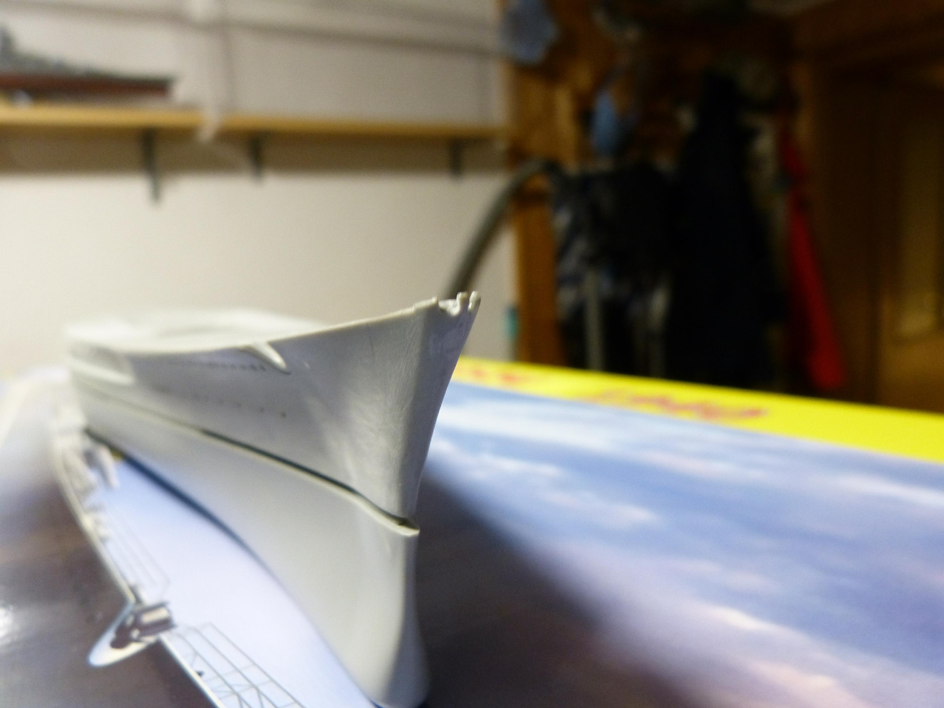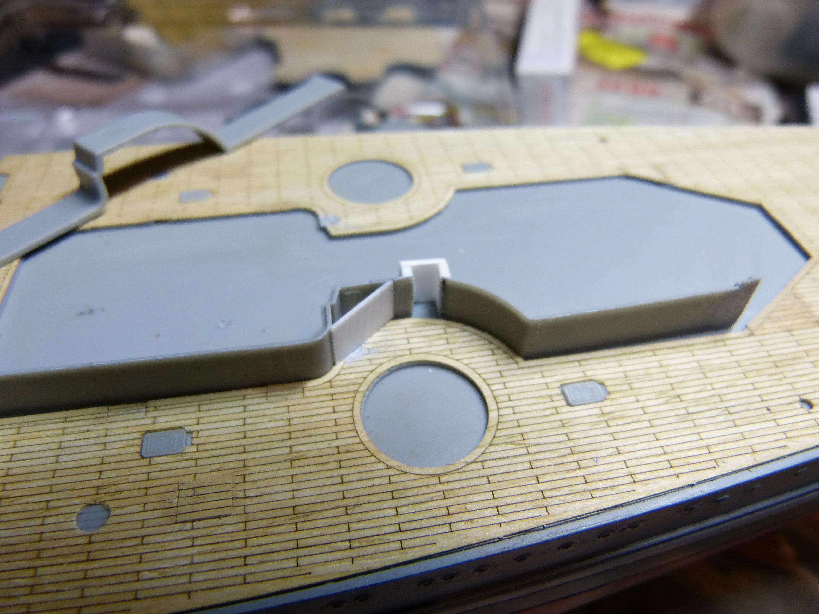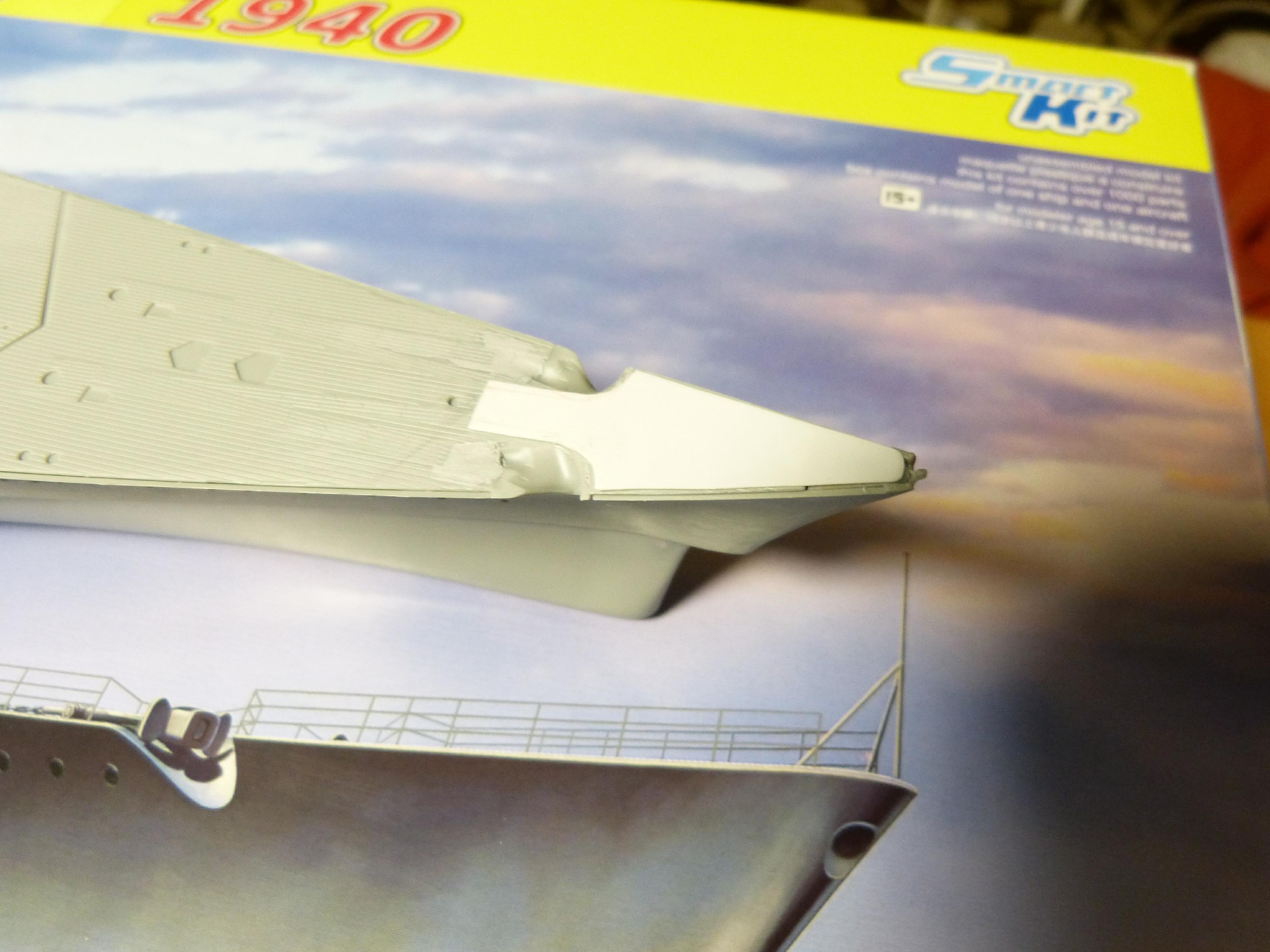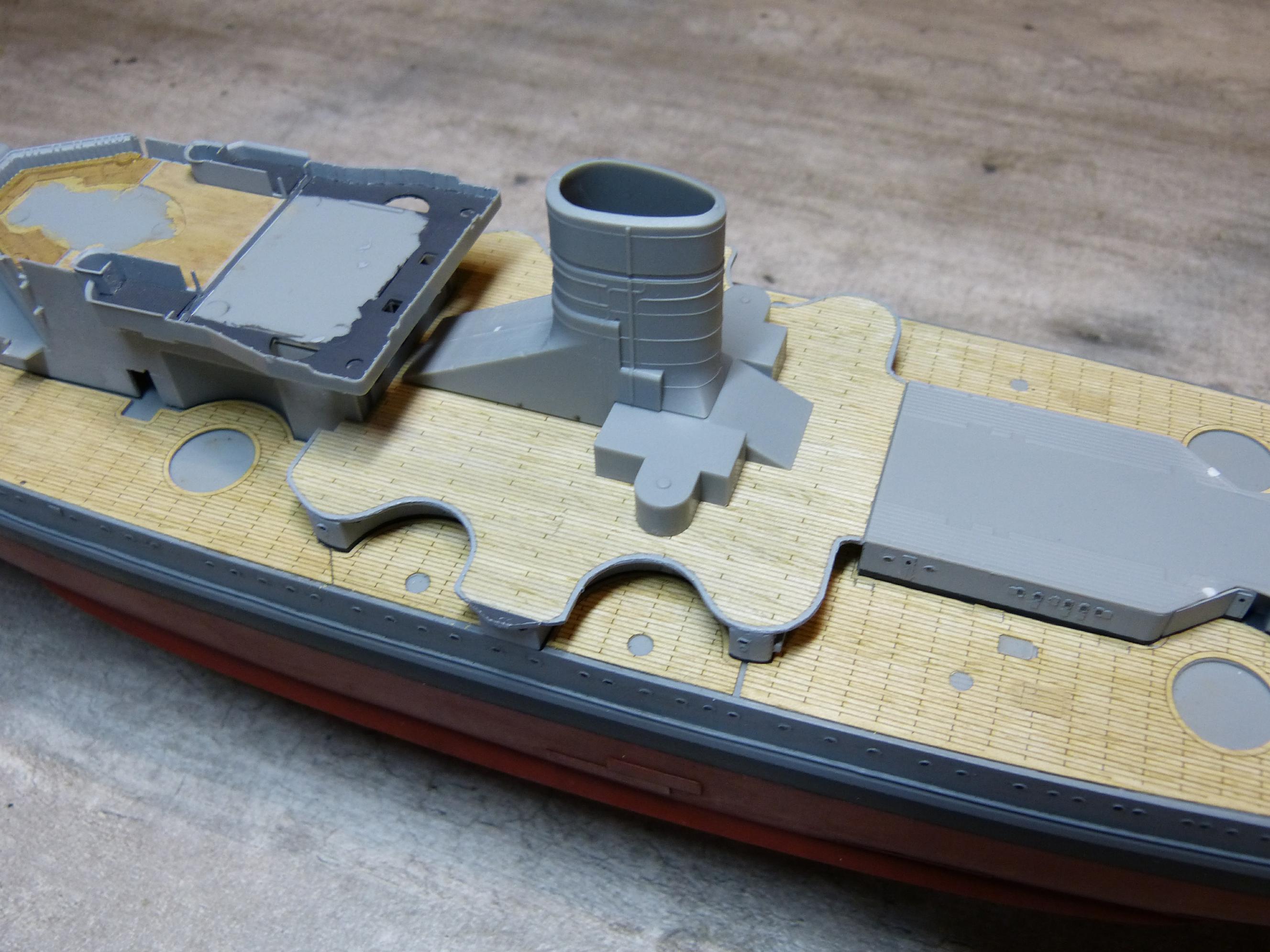 Zwischendurch habe ich mich mit der Bugsektion am Oberdeck befasst. Anders als bei SH ist der Teil bis zu den Ankerklüsen aus glattem Stahl ausgeführt. Auch eine Bugankerklüse gibt es nicht. Ferner war die Spitze anders ausgeführt, diese wurde mittels Schleifpapier angepasst. Die Stahldeck-Sektion entstand aus Plastiksheet 0,03 mm. Als Schablone habe ich das entsprechende Stück des Holzdecks verwendet. Vom Hauptdeck darunter musste auch ordentlich Material entfernt werden, damit das dünne Plastikteil gut anliegt.