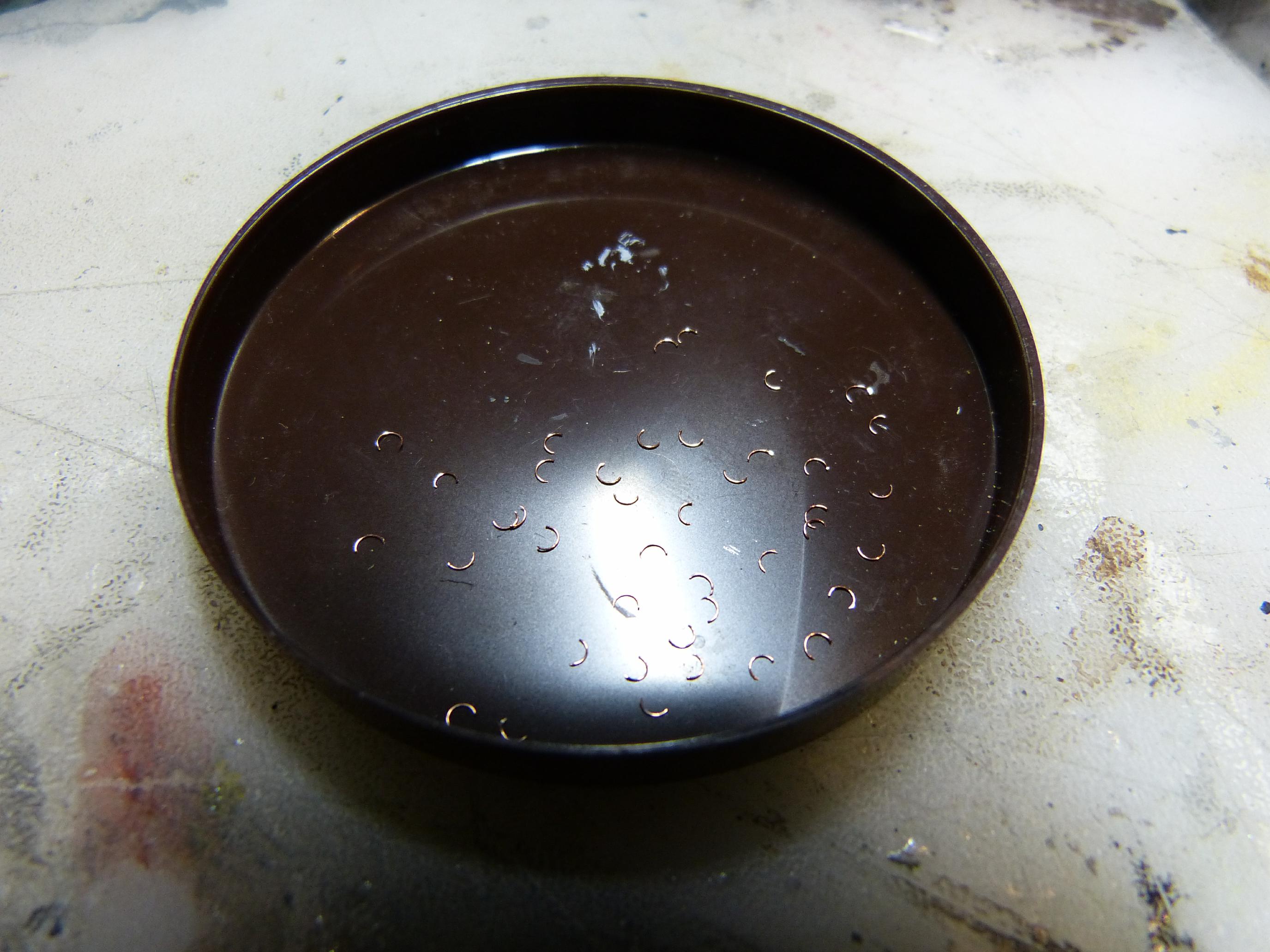 Mittels 0,05 mm-Edding angezeichnet, mit Reißnadel angepiekt, mit 1,1 mm-Bohrer sehr langsam gebohrt. Innen und außen entgratet.