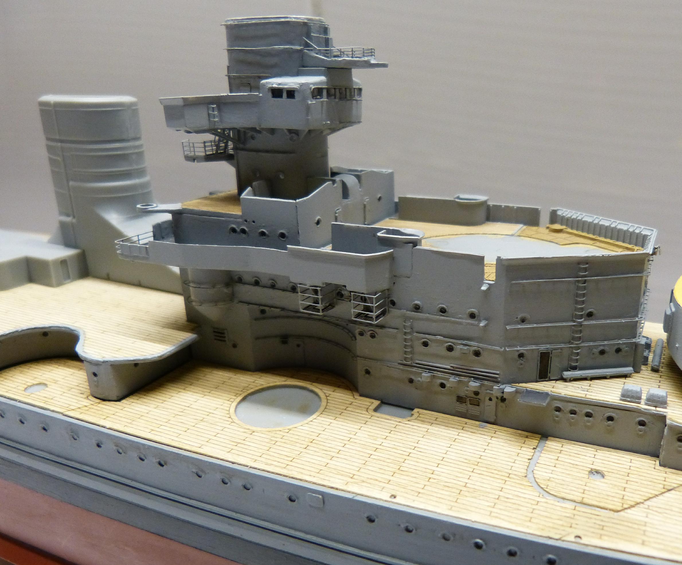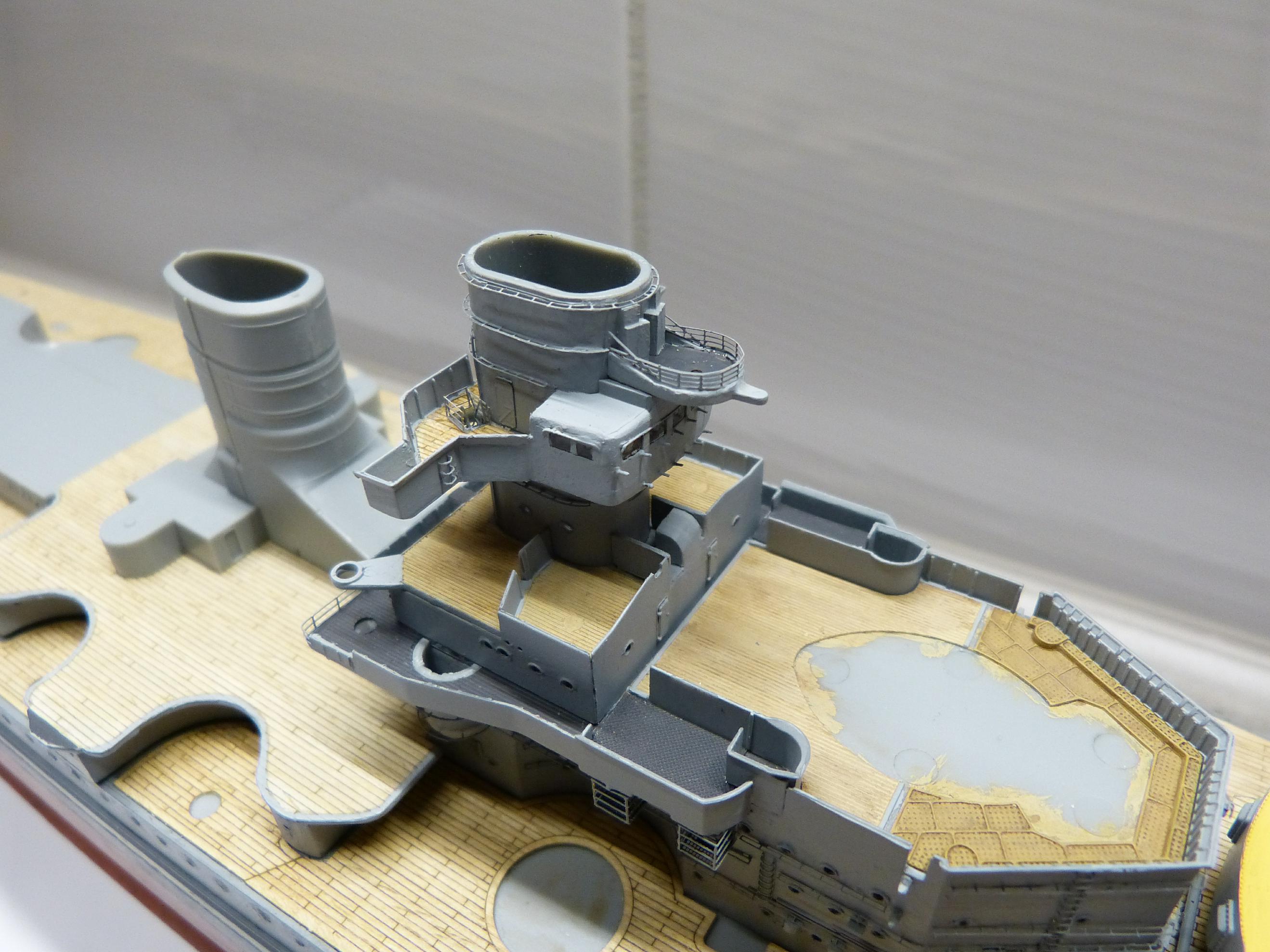 Ich habe mir lange überlegt, welchen Ausrüstungszustand ich meiner GNEISENAU verpasse. Am liebsten wäre mir der Urzustand mit geradem Steven 1938 gewesen. Dies habe ich jedoch wieder verworfen, da es ein Riesenaufwand gewesen wäre, aus dem Atlantik-Bug die entsprechende Bugpartie sauber herauszuarbeiten. Das Risiko, den Rumpf komplett zu versauen, war mir einfach zu groß. Ein später Zustand (Cerberus 1942) kam eigentlich auch nicht in Frage, nicht nur mangels konkreter Vorlage; auch hätte sie dann vielleicht zu sehr meiner SH geähnelt. Letztendlich entschied ich mich für Februar 1940 (vor „Operation Nordmark“) mit gelben Turmhauben (seit 16.1.40), noch ohne Fliegerkennung, mit Schleuder auf Turm Cäsar (am 22.2. entfernt).