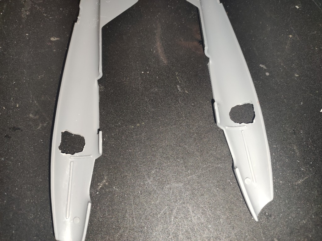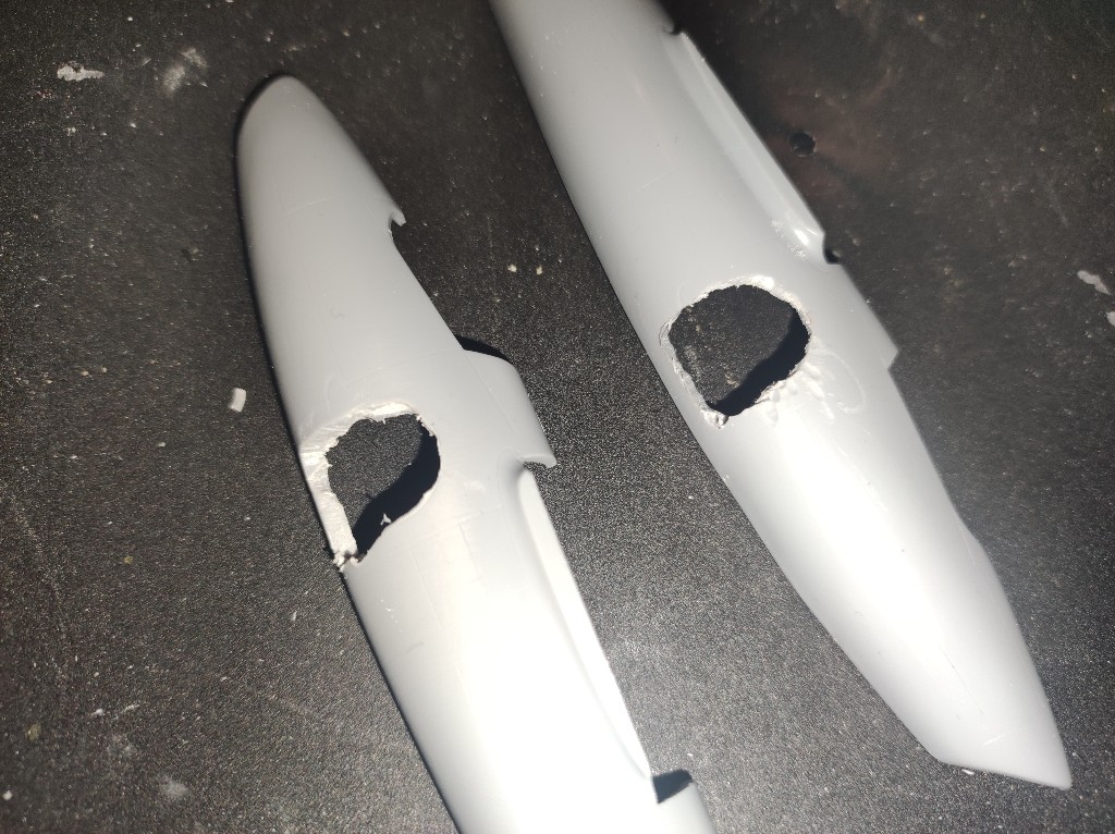 Natürlich wollte ich direkt loslegen. Der erste Schritt war dann auch gleich der schwierigste. Aus dem nur schwer zu erkennenden Relief für das geschlossen Fahrwerk müssten die Löscher für die Fahrwerksschächte geschnitten werden