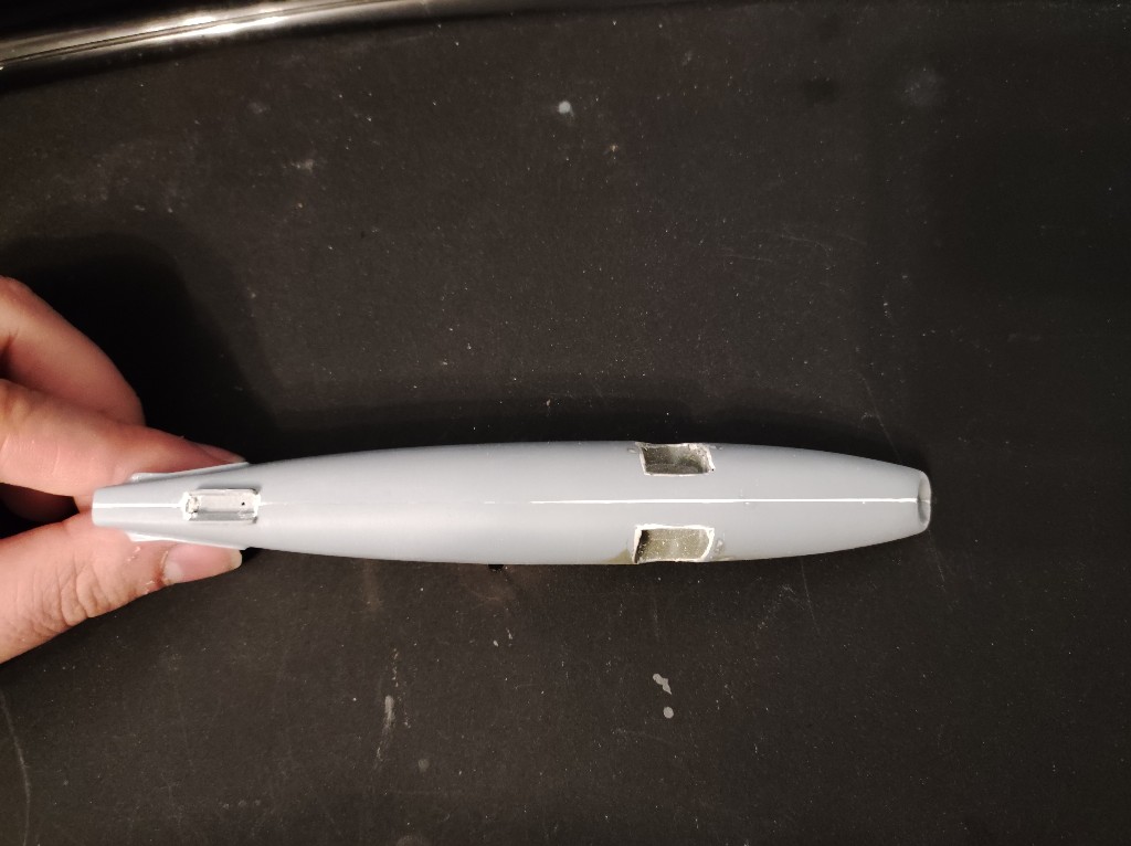 Dabei habe ichich aufgrund der Stärke des Plastiks versägt und zuviel entfernt. Das dann später wieder angeklebt, verschlieffen und nochmal die restlichen Flügelwurzeln entfernt.