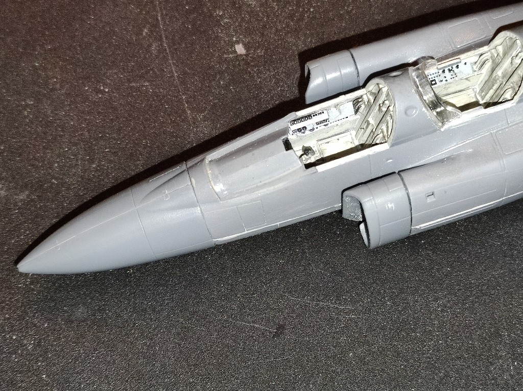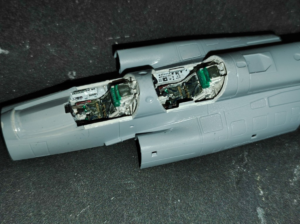 Das ganze wurde dann in den Rumpf eingesetzt. Das passte wirklich wie angegossen. Die Teile aus dem Bausatz sind übrigens auch sehr detailiert, leider liegen aber keine Abziehbilder bei, auch die Sitze sind nicht ganz so überzeugend, um eben die Instrumente alle darzustellen.