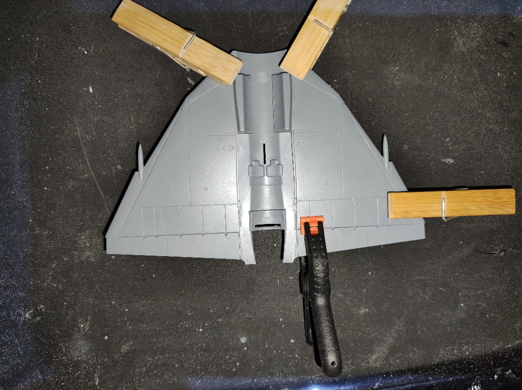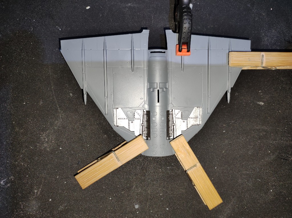 Die Deltaflügel waren danach an der Reihe. Diese sind schon ziemlich groß. Und vorallem ist es auch wichtig diese jetzt schon anzubringen um die Rumpfhälften richtig auszurichten