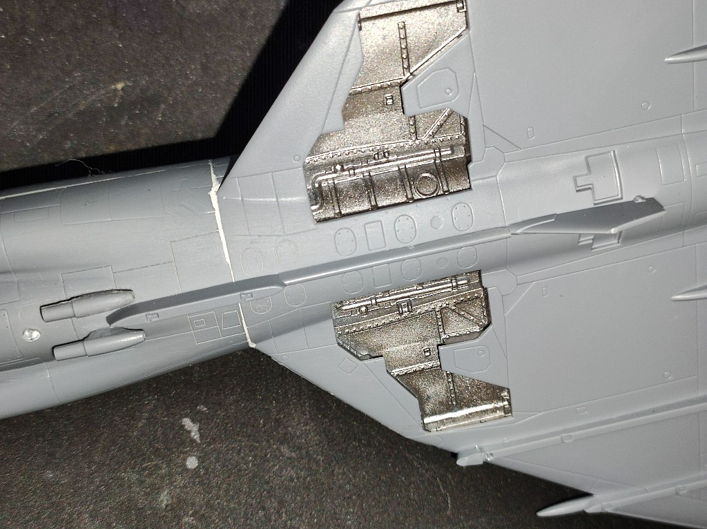 Die Unterseite habe ich schon lackiert. Die Farbe ist Ammo of MiG Light Compas Ghost Grey, also ein sehr helles blau-grau. Auch der Zusatztank wurde so lackiert. Hier sind die Übergänge auch gut weg