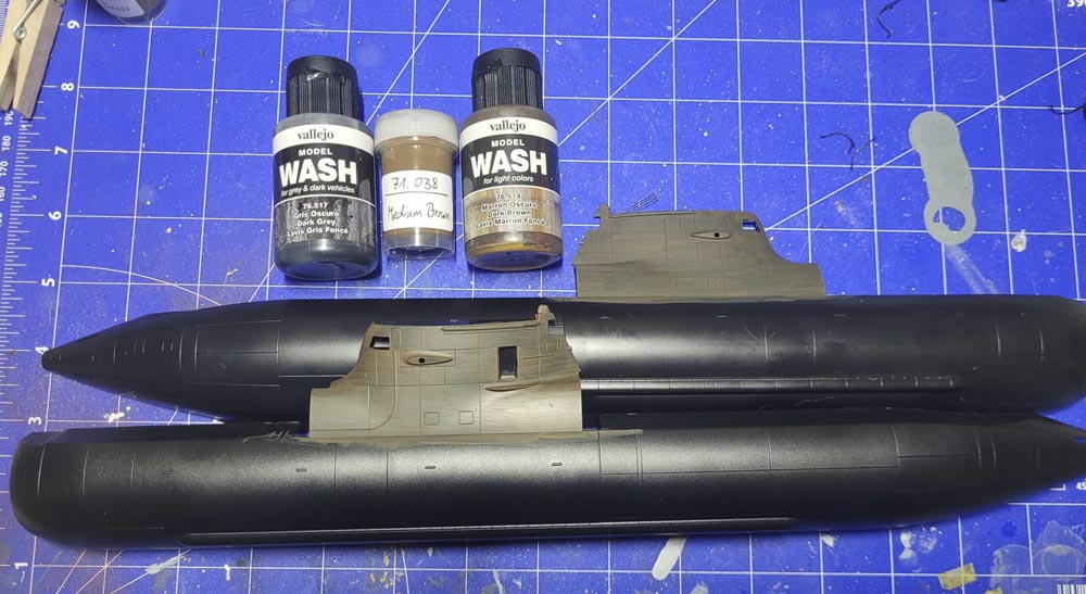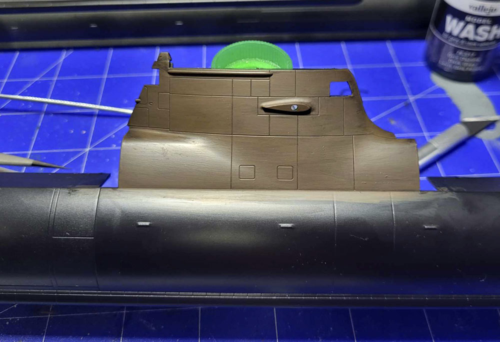 Wie schon eingangs erwähnt, wollte ich dem U-Boot mit der Farbe "Medium Brown" einen braunen Grundanstrich verpassen und dann mit dem dunkelgrauen Wash nachdunkeln. Das Testergebnis am Turm gefällt mir aber nicht, denn es ist trotzdem noch zu hell. Also muss ein dunkleres Braun her....