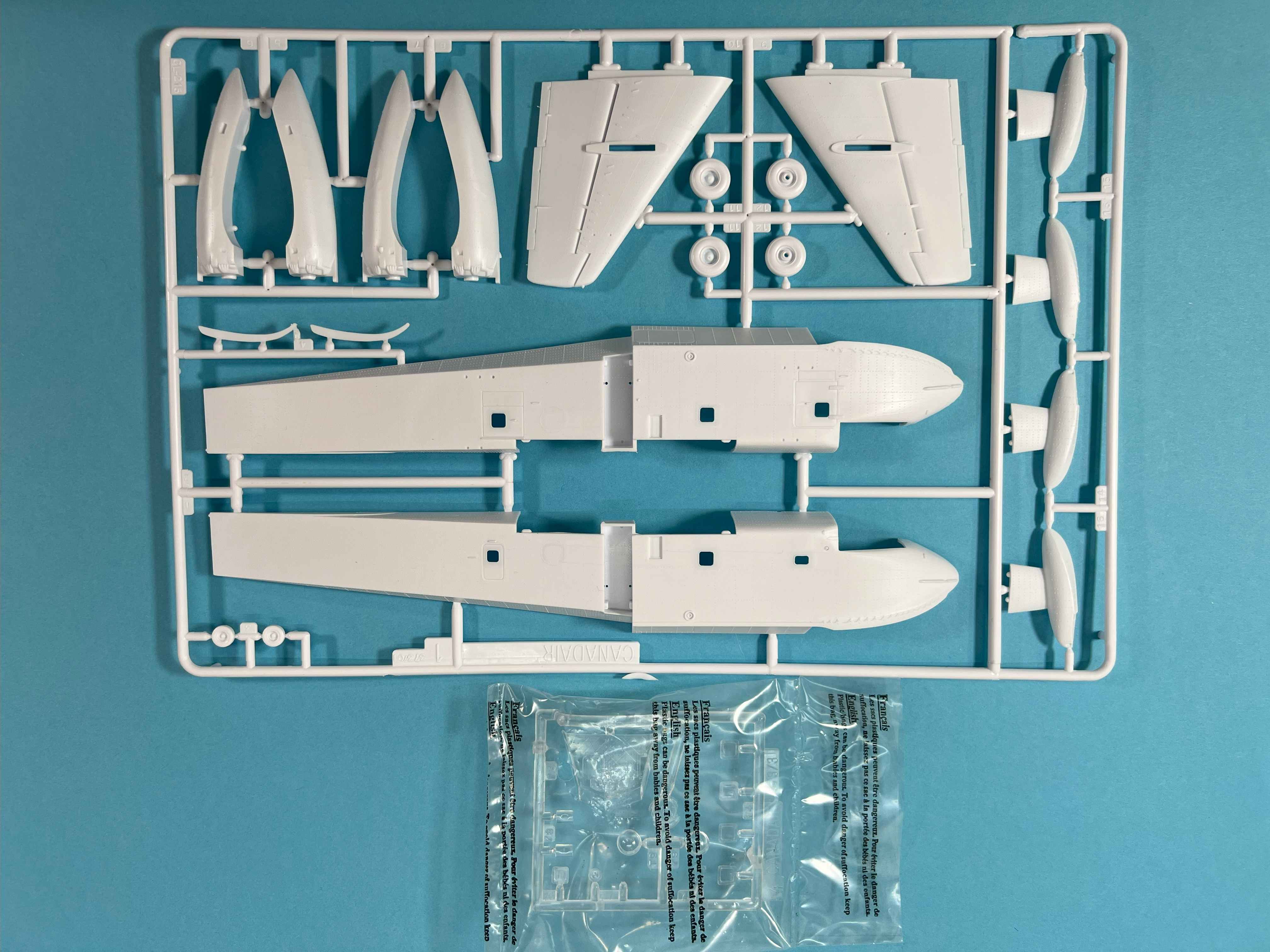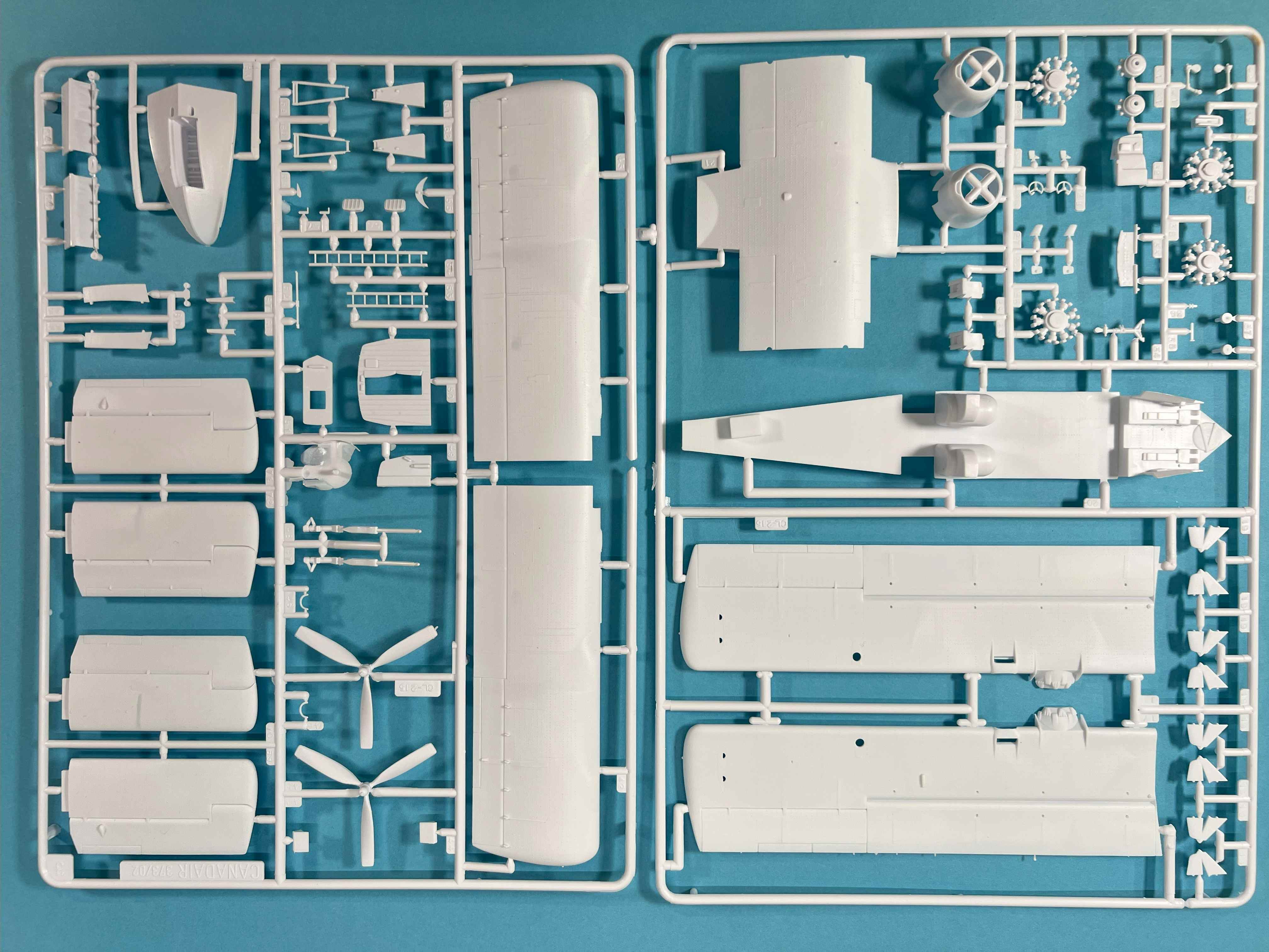 Der Bausatz kommt mit drei weißen und einem Klarsicht Spritzling daher. Die Bauanleitung ist farbig und hat eine gute Qualität.
