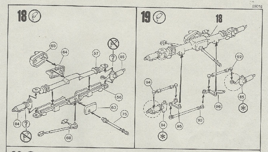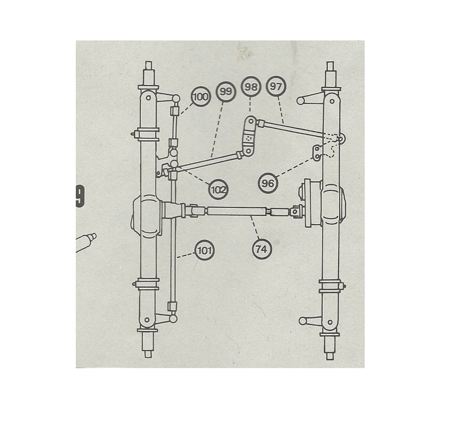 Die Räder sollen etwas eingelenkt stehen. Hierzu beginnt man mit einem Achsschenkel z.B. Teil 84 indem man ihn etwas schräg einklebt. Dann Teil 95 mit Teil 94 ausrichten, Teil 96 mit Teil 93 usw. bis zum Achsschenkel 85.