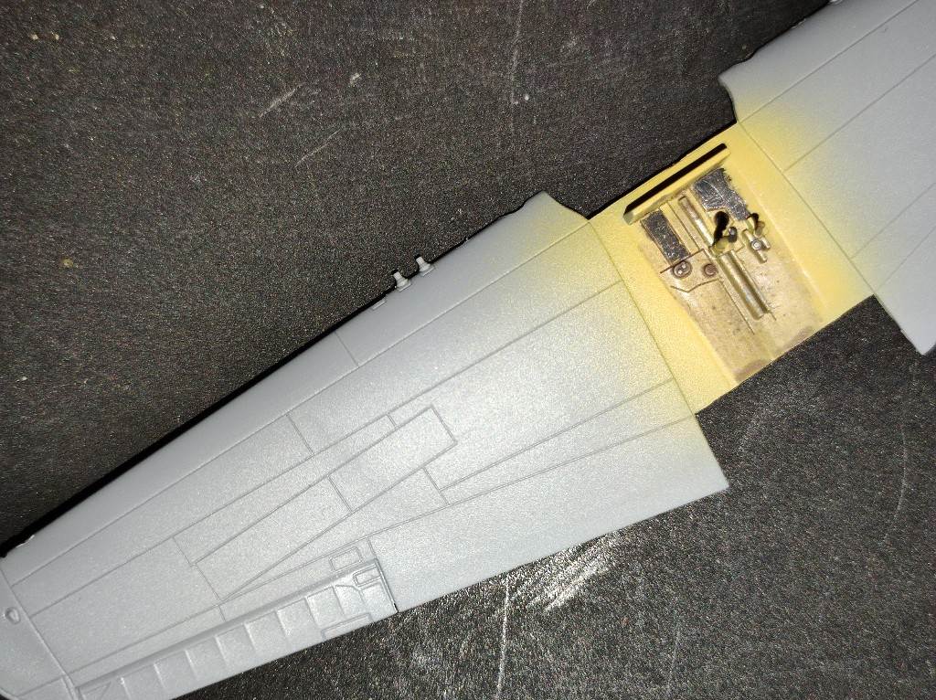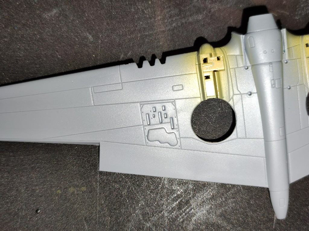 Genau dafür liegen die 3D-Teile bei und die PE-Schablone. Der Bausatz richtet sich an die fortgeschrittenen Modellbauer, und verlangt in den nächsten Schritten die Flügel eigenständig umzubauen, d.h. die beiden Äußeren MG's entfernen und auch die alten Gravuren zu verspachteln und neu zu ziehen. Dazu werde ich dann später kommen.