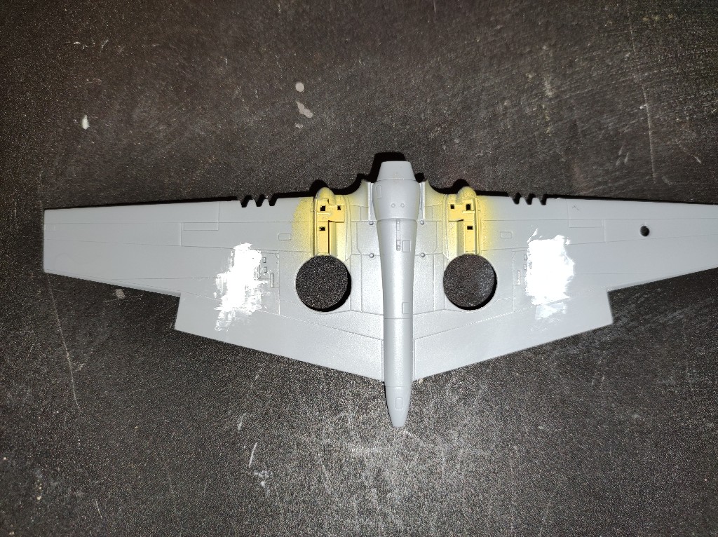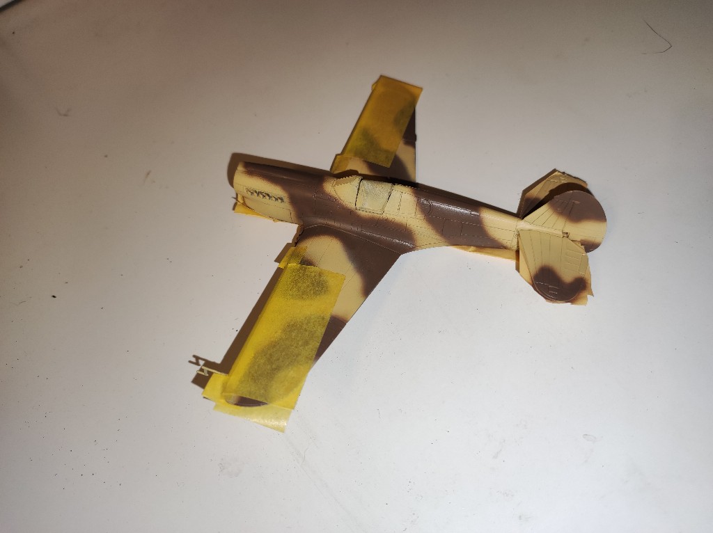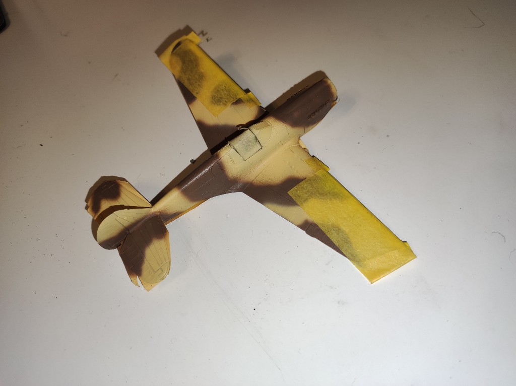 Anschließend ging es mit Azur-Blau und Sandgelb an die Farbe des Flugzeugs. Lackiert habe ich mit meiner großen Airbrush. Inder Anleitungen wird übrigens eine andere Farbe, nämlich RAF middle Stone angegeben. Nur diese Farbe geht schon fast ins rötliche und passt gar nicht zu dem in Vorbild.