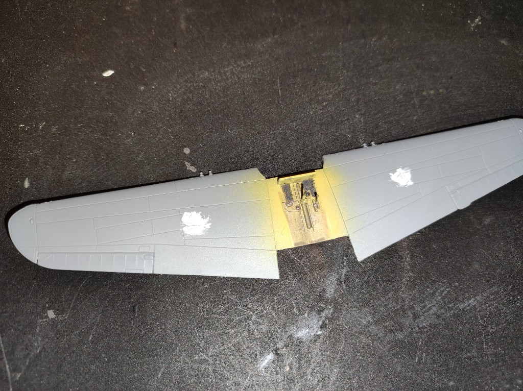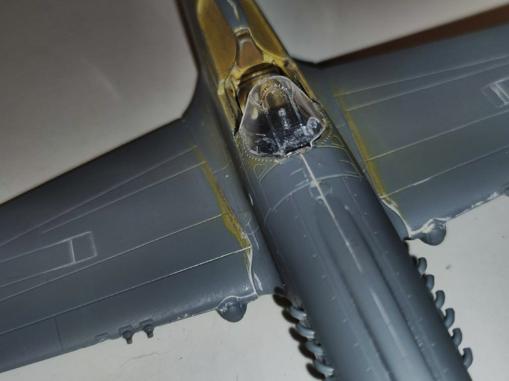 Zuerst habe ich kleinere Baugruppen vorbereitet. Die Innenseiten des Cockpits, Cockpitboden, Fahrwerksschacht und die Räder. Alles ist bereits vorbereitet