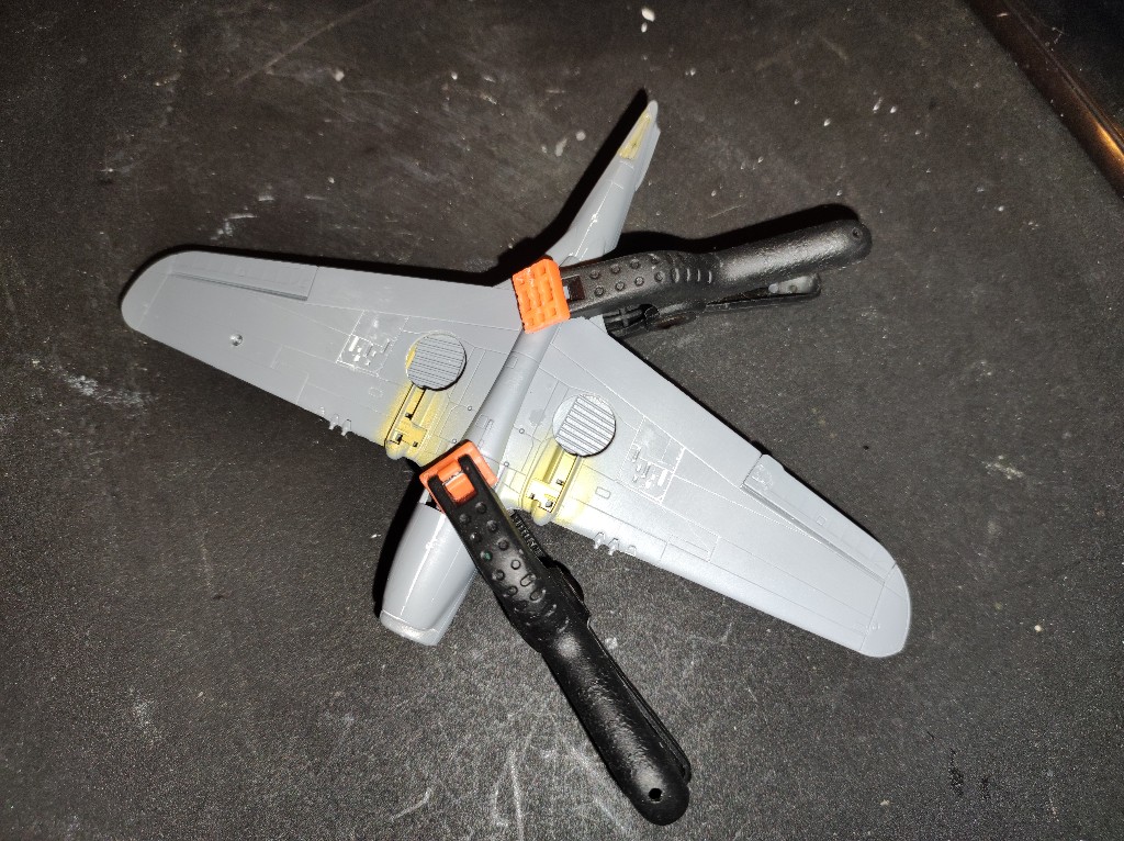 Ich habe die Farbe bestellt und werde die Oberseite nochmal komplett anders machen. Auch an der Unterseite werde ich ein kleinen Teil nochmal lackieren, da der hintere Rumpf asymmetrisch geworden ist