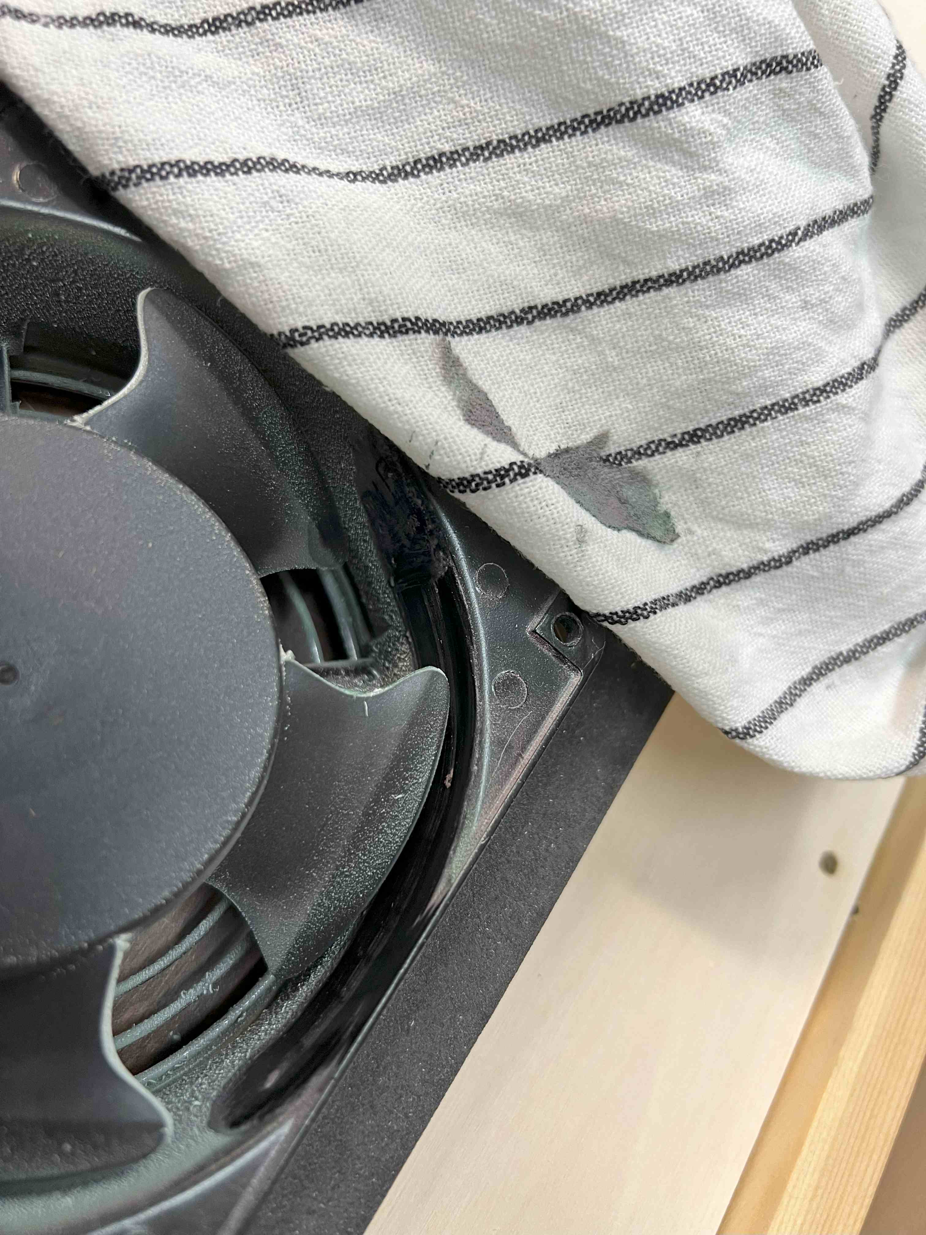 So genau hatte ich bisher dort gar nicht hingeschaut. Man sieht Ablagerungen an den Lüfterblättern, wie auch an den Lüfterrahmen. Es scheint aber maßgeblich von einer früheren Sprühaktion zu kommen, da ich zuletzt ziemlich viel mit grüner Farbe und Klarklack gesprüht habe. Die Ablagerungen sind hauptsächlich weiß bis grau, mit einem leichten Grünschimmer.
