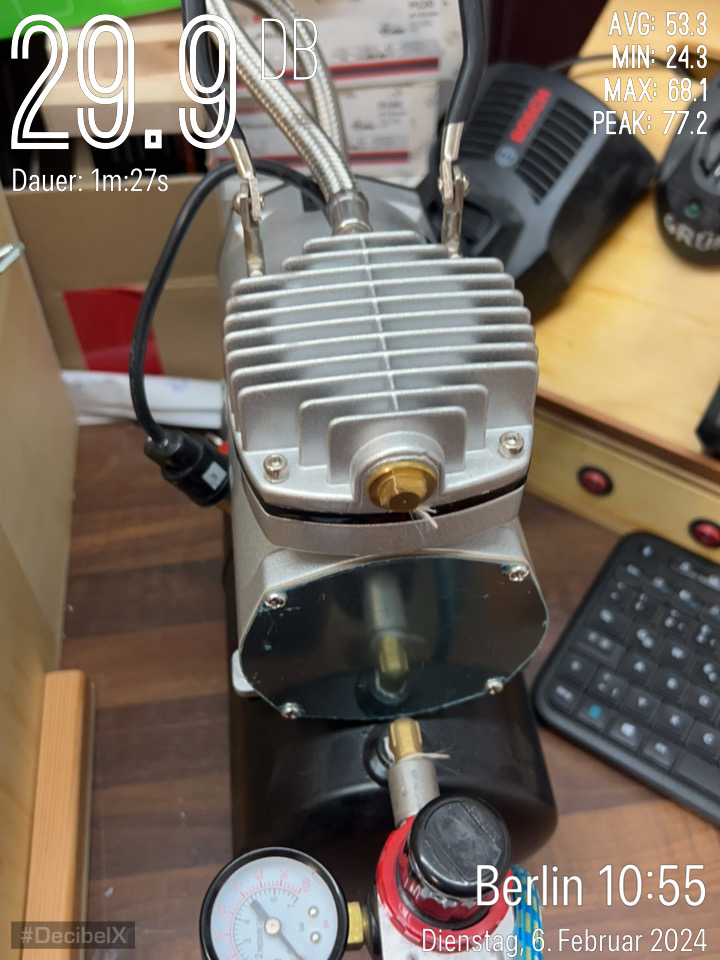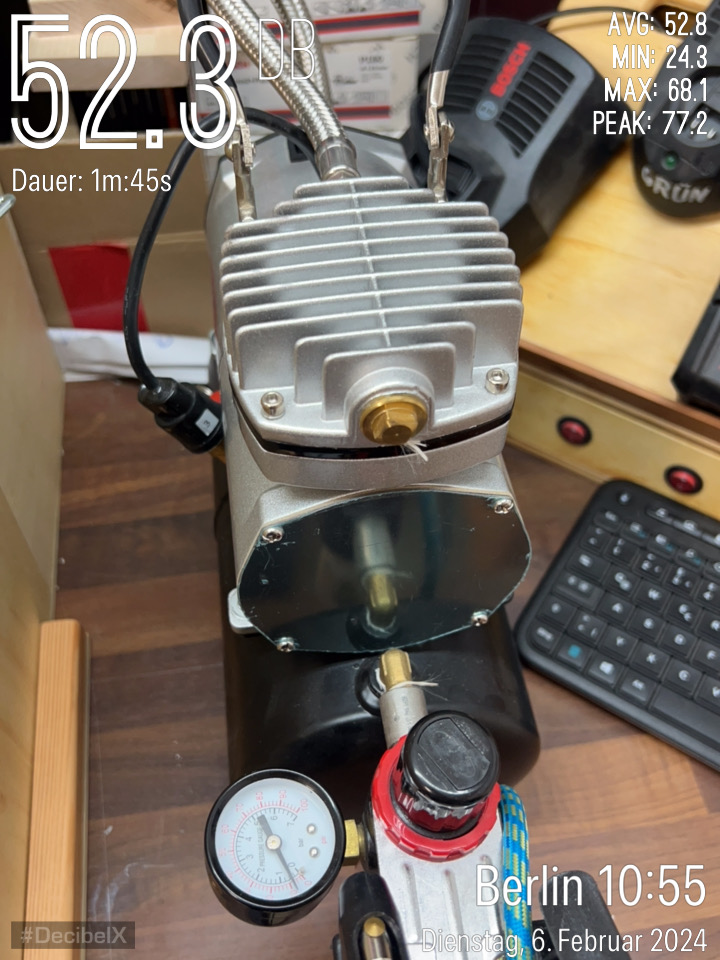 Wie man sieht ist der Kompressor nicht mal lauter als meine Kabine, aber das Geräusch des Kompressor empfinde ich als wesentlich unangenehmer als das Rauschen der Kabinen-Lüfter. Das zeigt natürlich auch deutlich, das Lautstärke vom persönlichen Empfinden abhängt.