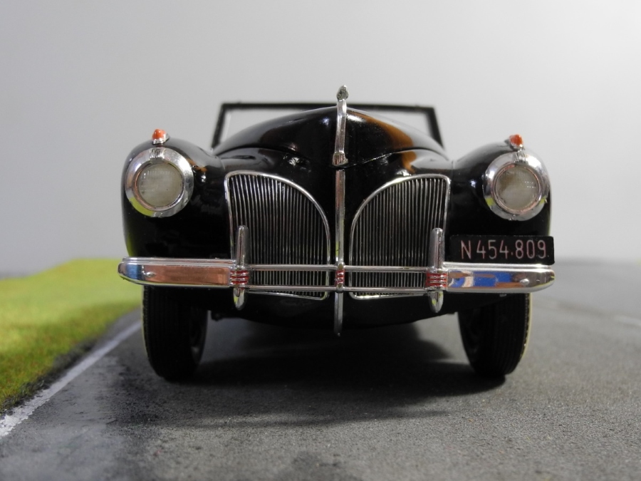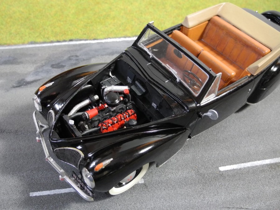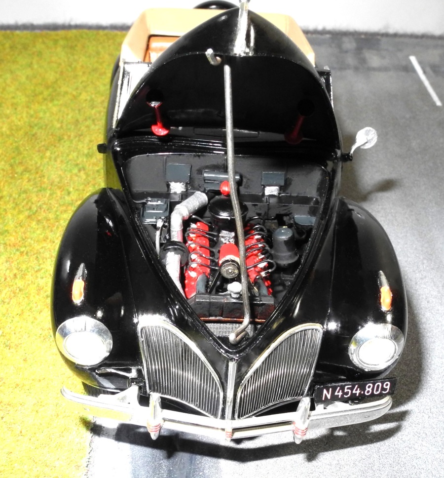 Unter der ebenfalls losen Motorhaube (leider kein Scharnier) steckt eine plumpe Motornachbildung, die ich durch Zündkabel und Batterieanschlüsse etwas ergänzt habe:
