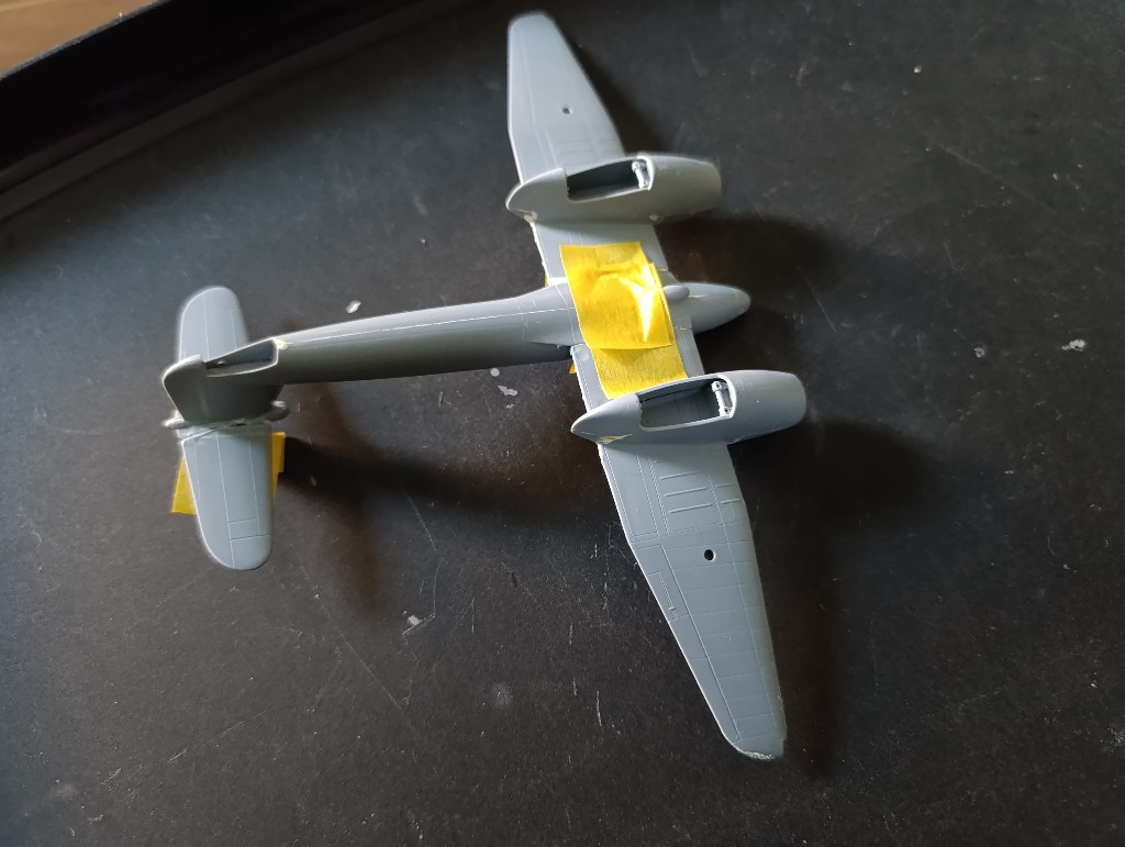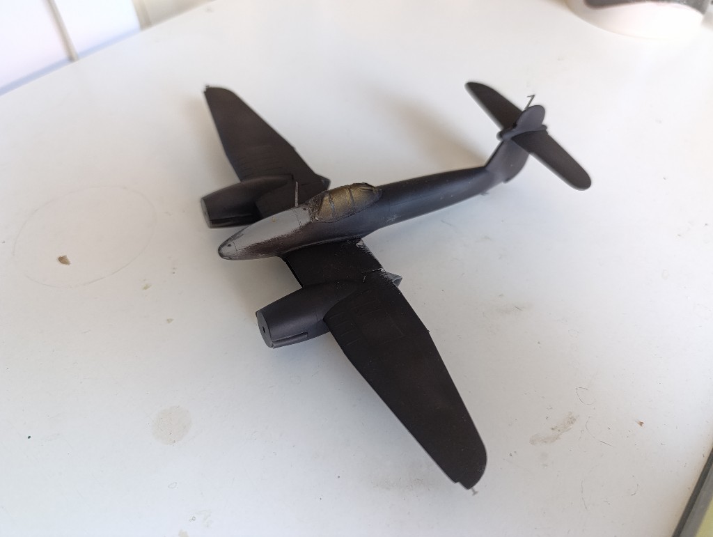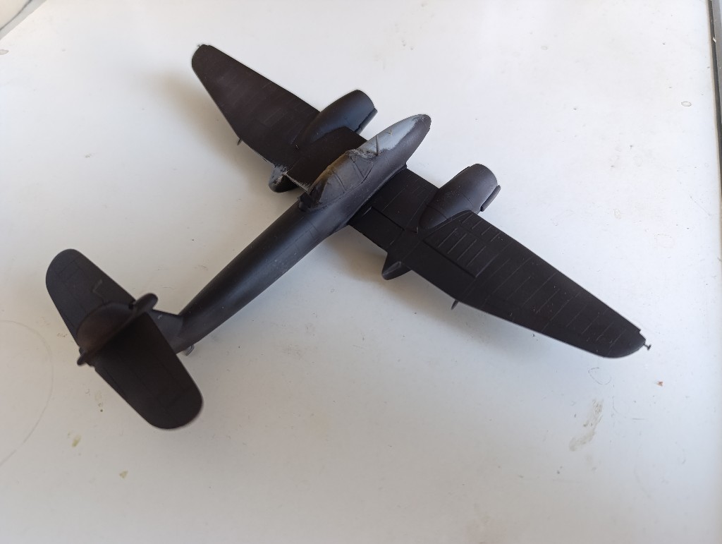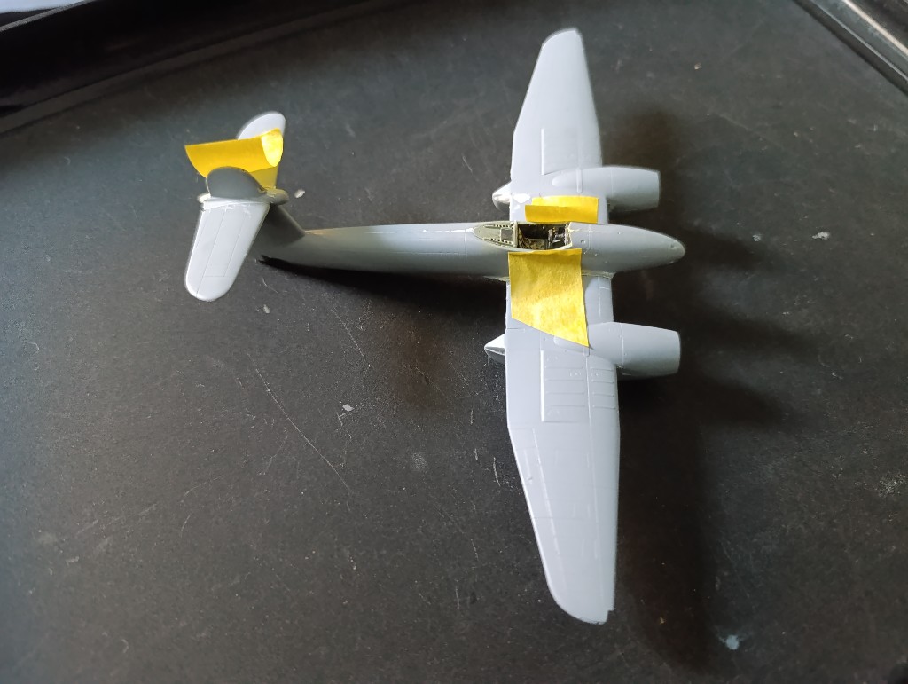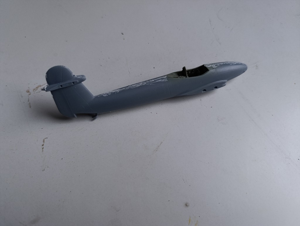 Die Whirlwind ist nun grundiert, leider sind die Spalte am Flugzeug immer noch zu sehen... Also zurück zur Spachtelmasse und die schmalen Übergänge nochmal bearbeiten