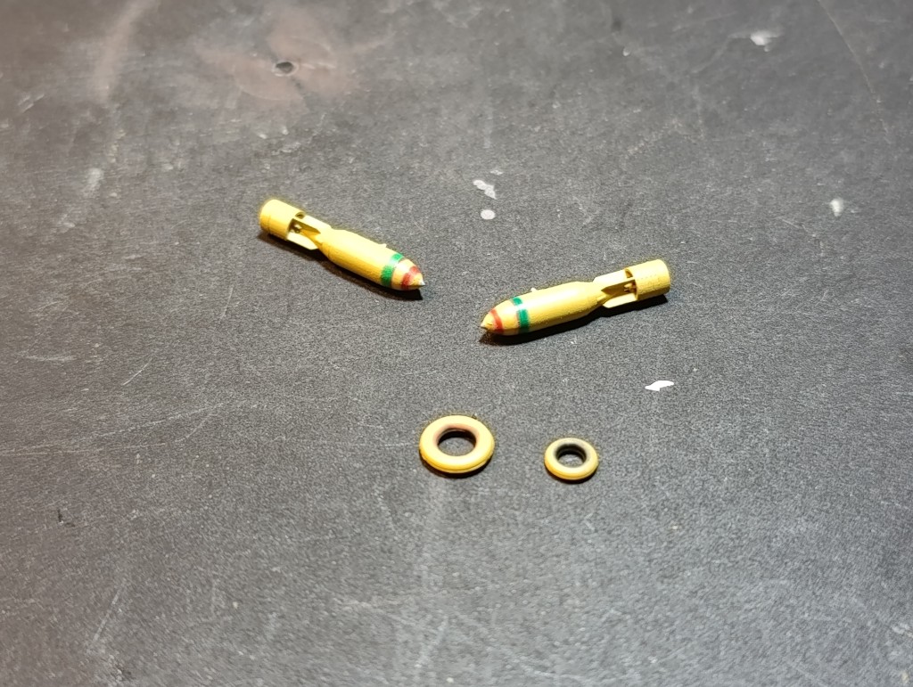 Für die Ringe an den Bomben hätte ich wahrscheinlich Decals genommen. Streifen schneiden und lackieren.
