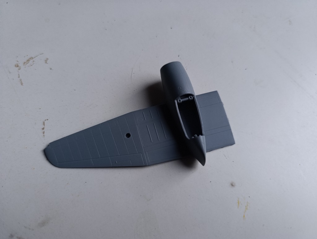 Als nächstes werde ich die Übergänge zum Rumpf bearbeiten und die Strukturen nachgravieren. Übrigens Verbrachte ich dann eine ganze Weile damit, das abgefallenen Spornrad zu suchen (Erfolgreich