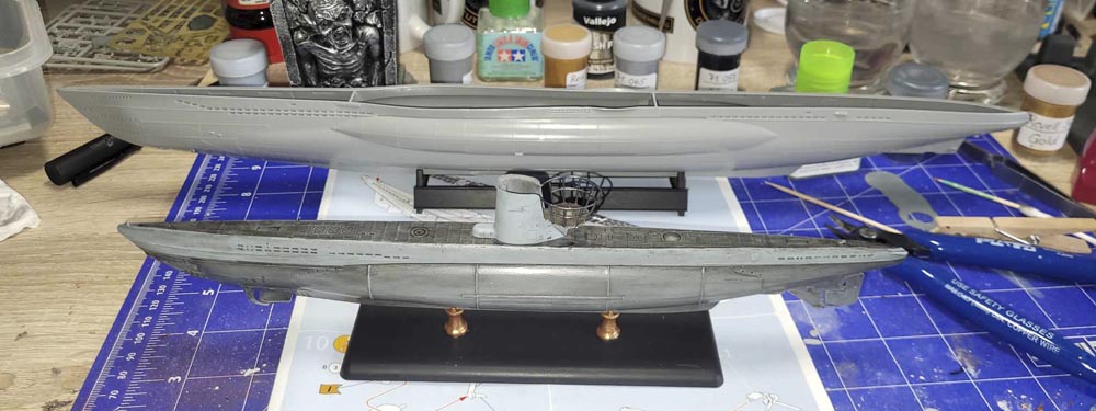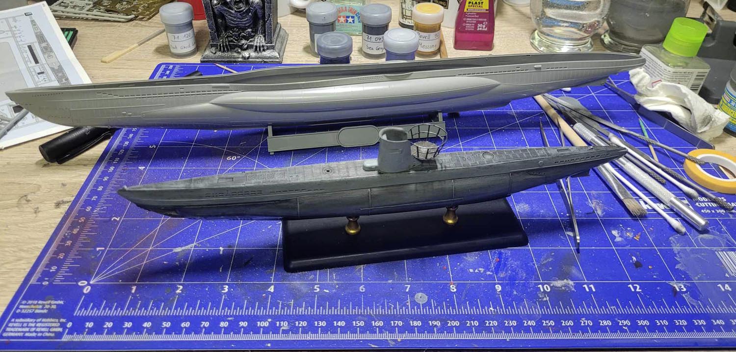 Wie man sehen kann, hat das kleine Boot schon seinen Anstrich und auch den Turm, vom Typ VII habe ich gerade mal den Ständer zusammengeklebt und die beiden Rumpfhälften unverklebt reingestellt.