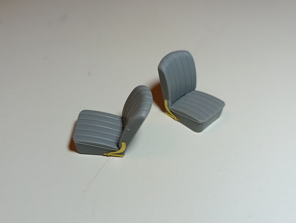 Die Rückbank war zusammen gesetzt fürs Lackieren. Was auch zügig gegangen ist. Waren ja nur vier Teile, dafür aber die Sitze...